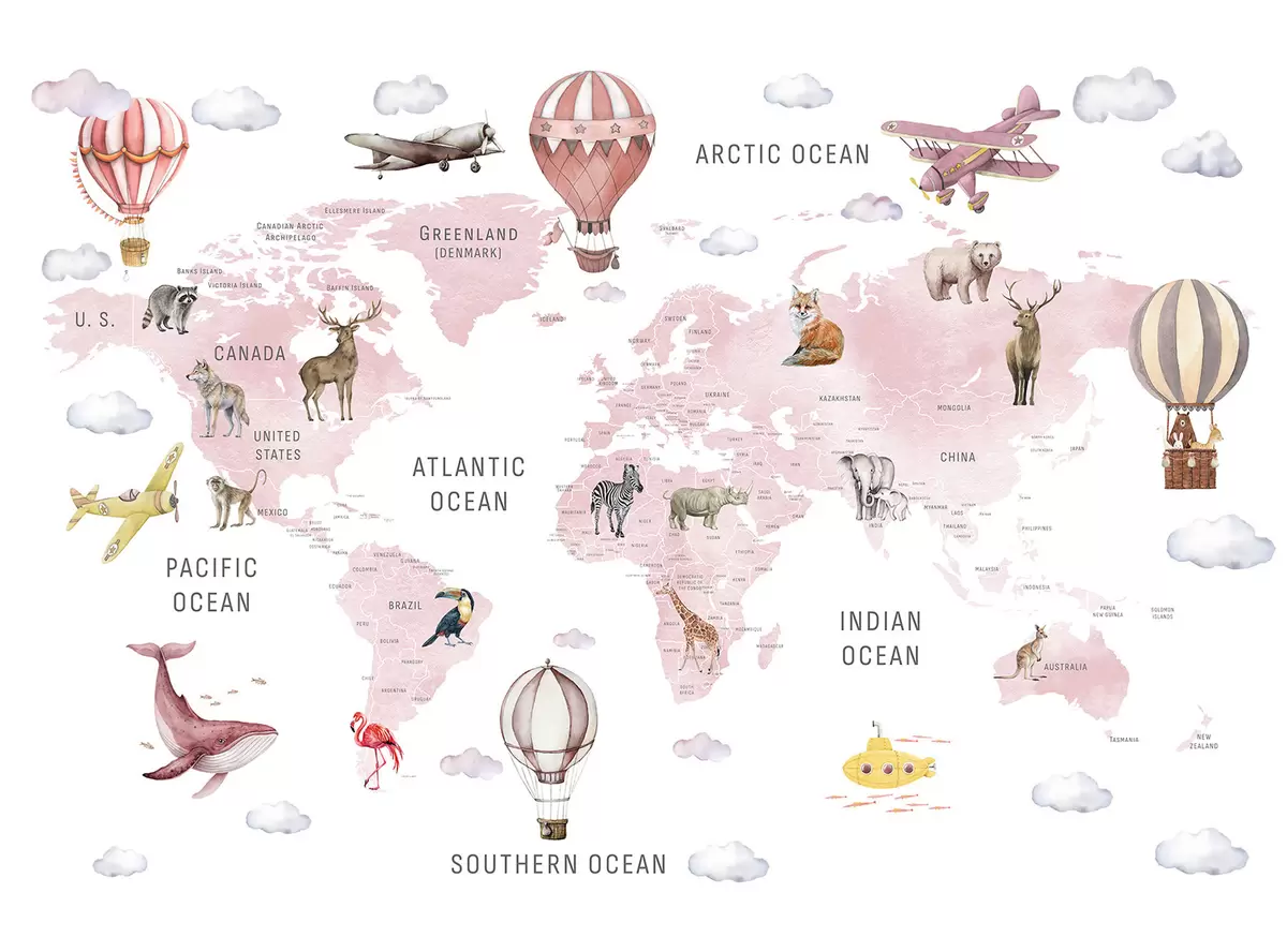Fototapety Dětská mapa v akvarelovém stylu se zvířaty a horkovzdušnými balóny. Anglický jazyk. Růžová barva. Č. c00001env3