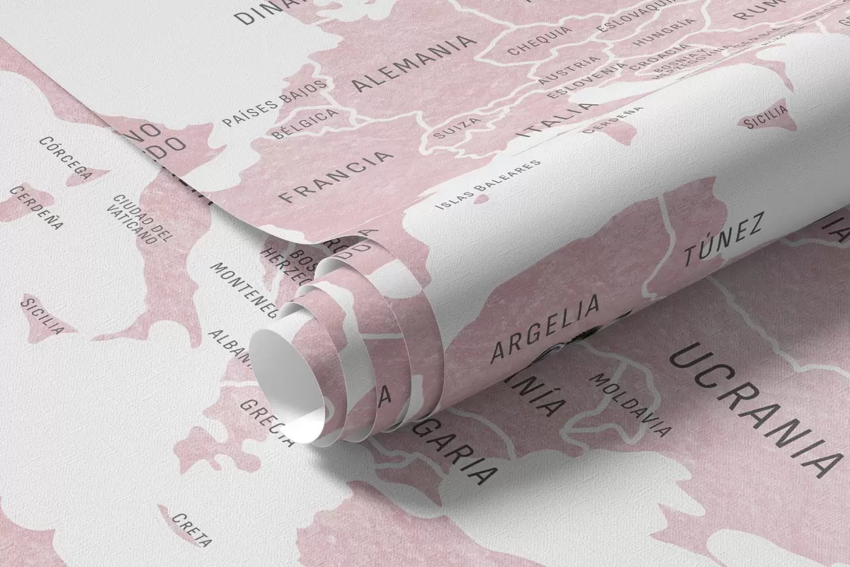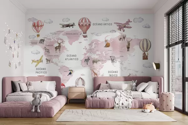 Fototapety Dětská mapa v akvarelovém stylu se zvířaty a horkovzdušnými balóny. Španělský jazyk. Růžová barva. Č. c00001esv3