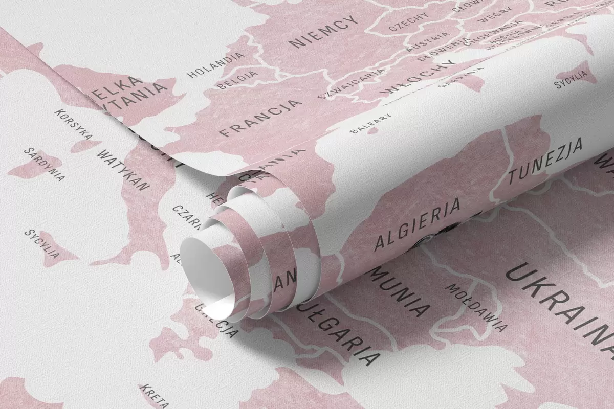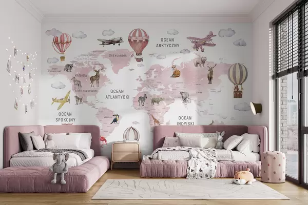 Fototapety Dětská mapa v akvarelovém stylu se zvířaty a horkovzdušnými balóny. Polský jazyk. Růžová barva. Č. c00001plv3