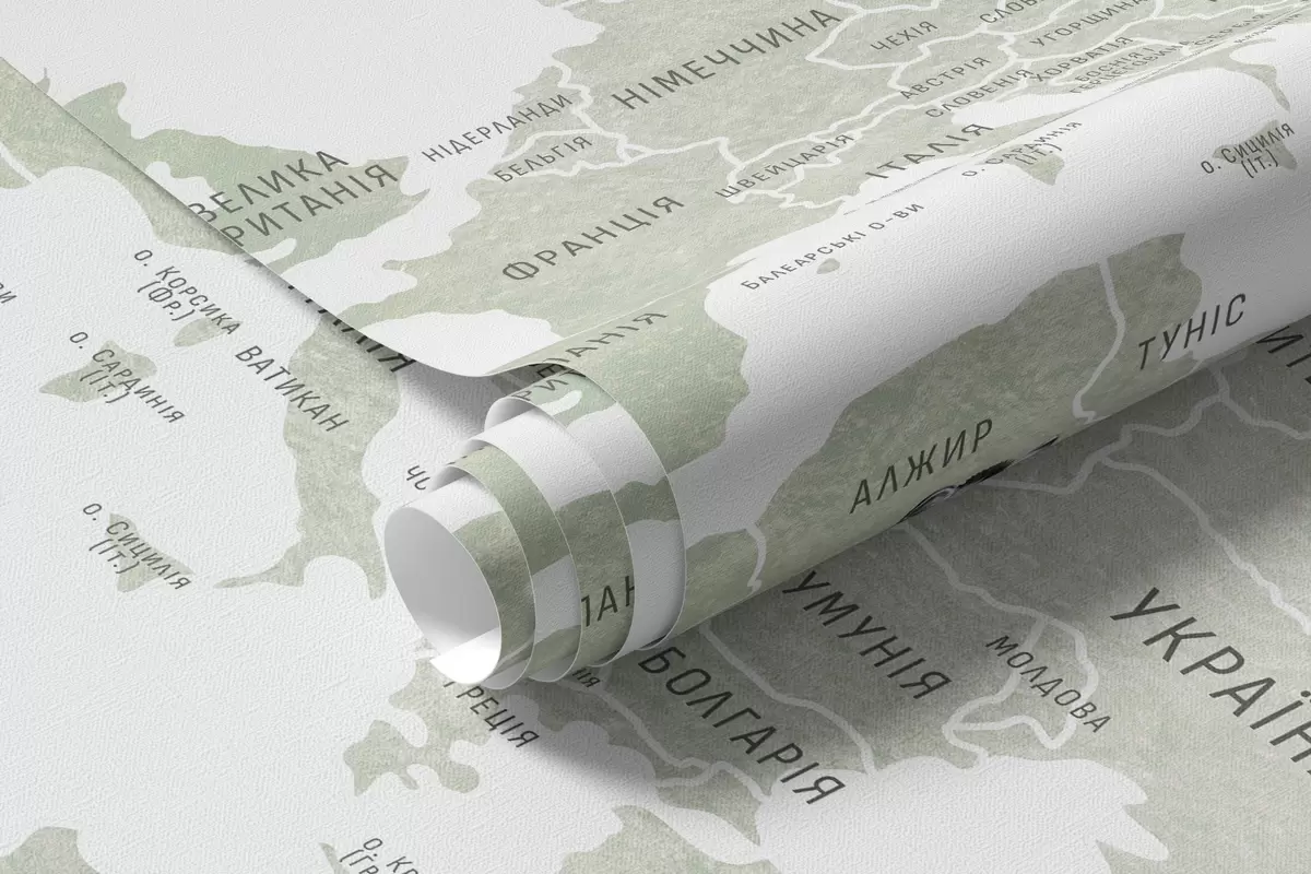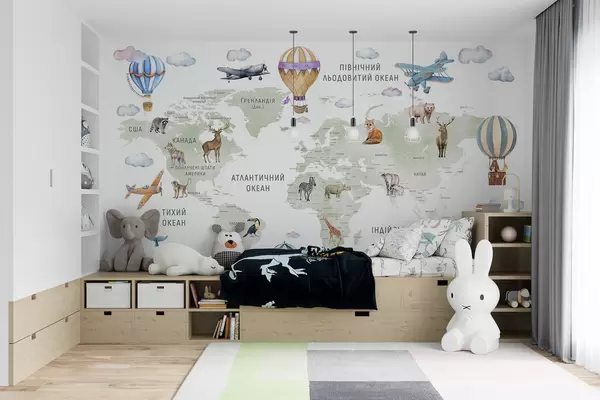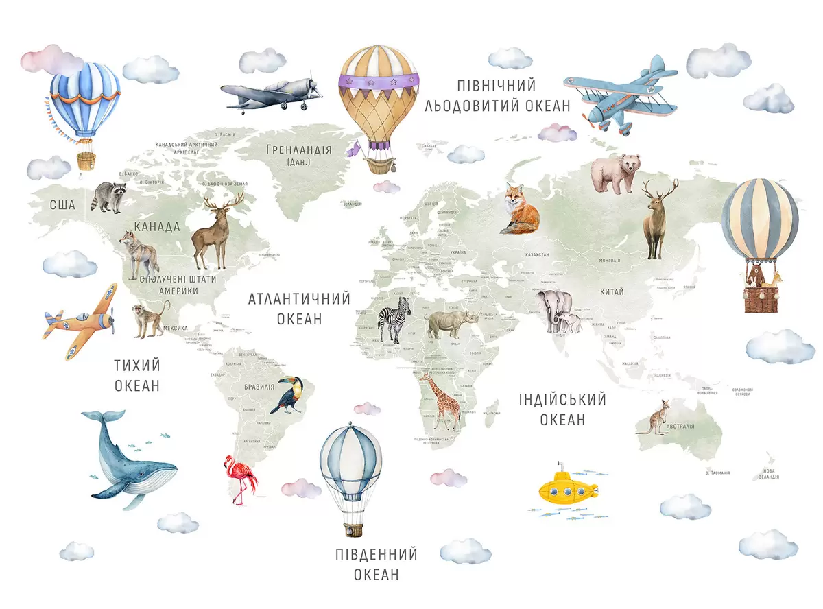Fototapety Dětská mapa v akvarelovém stylu se zvířaty a horkovzdušnými balóny. Ukrajinský jazyk. Zelená barva. Č. c00001uk