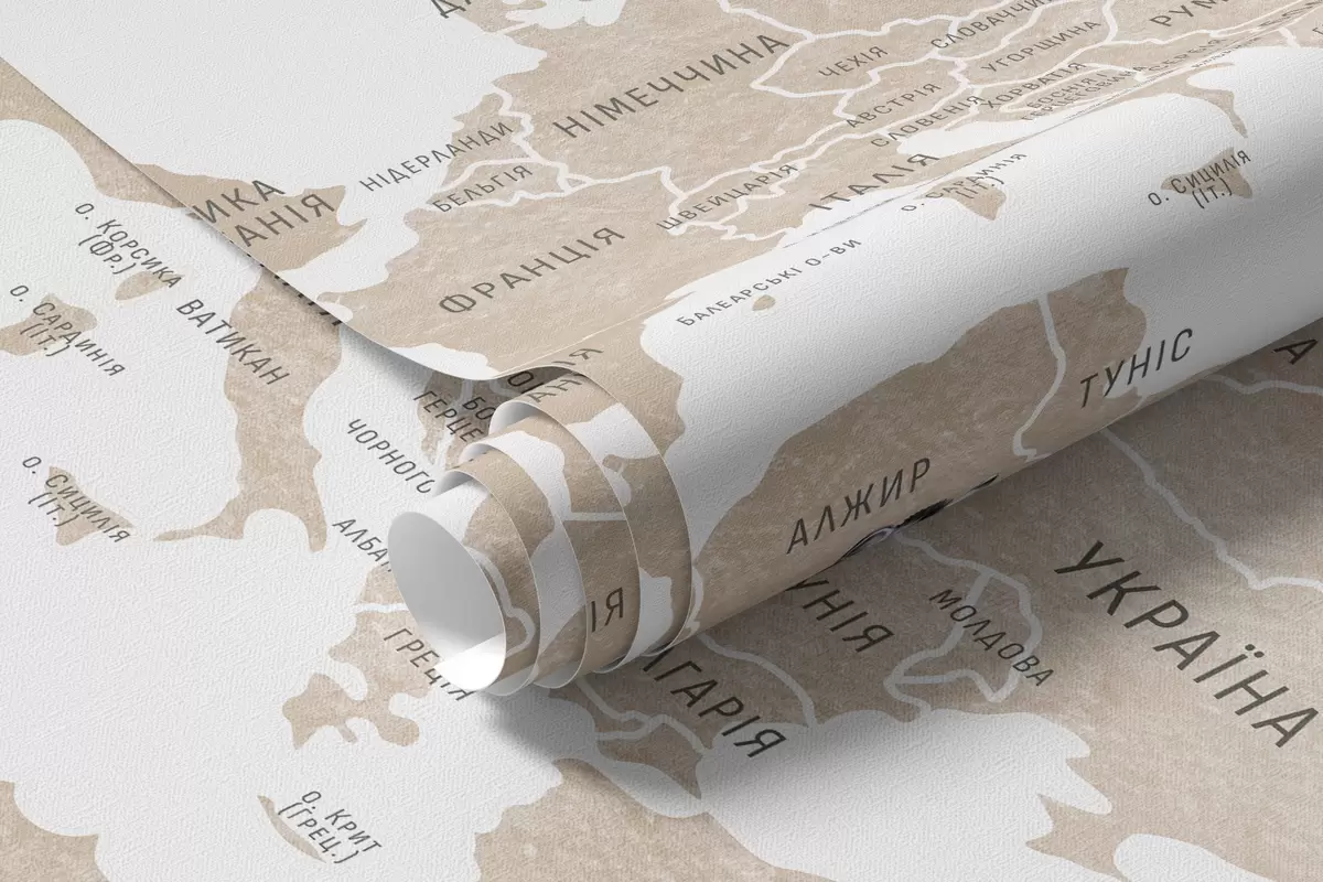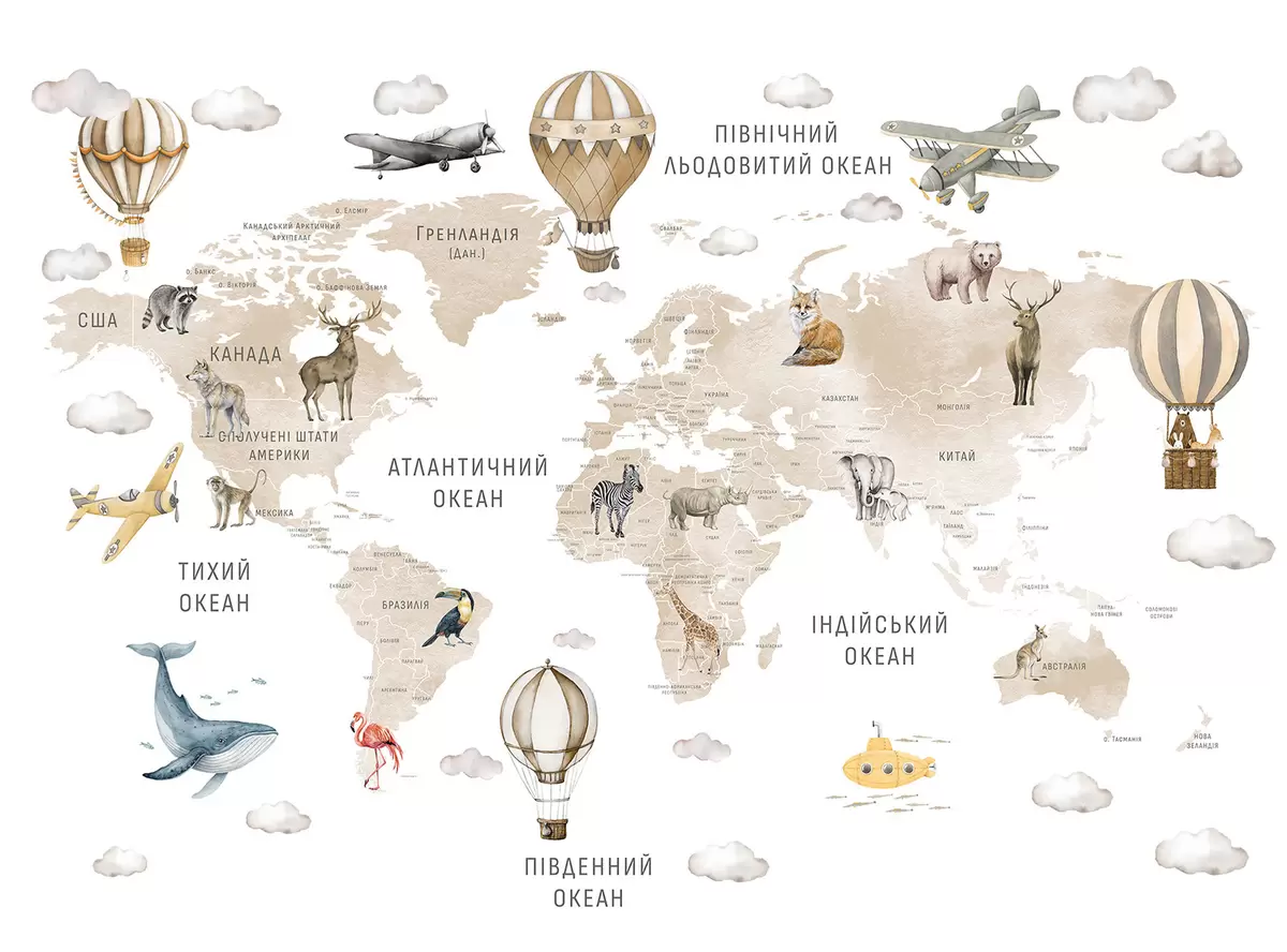 Fototapety Dětská mapa v akvarelovém stylu se zvířaty a horkovzdušnými balóny. Ukrajinský jazyk. Béžová barva. Č. c00001ukv2