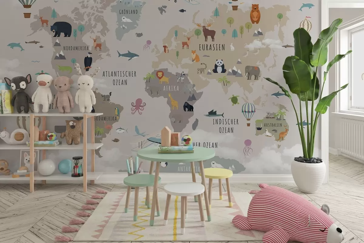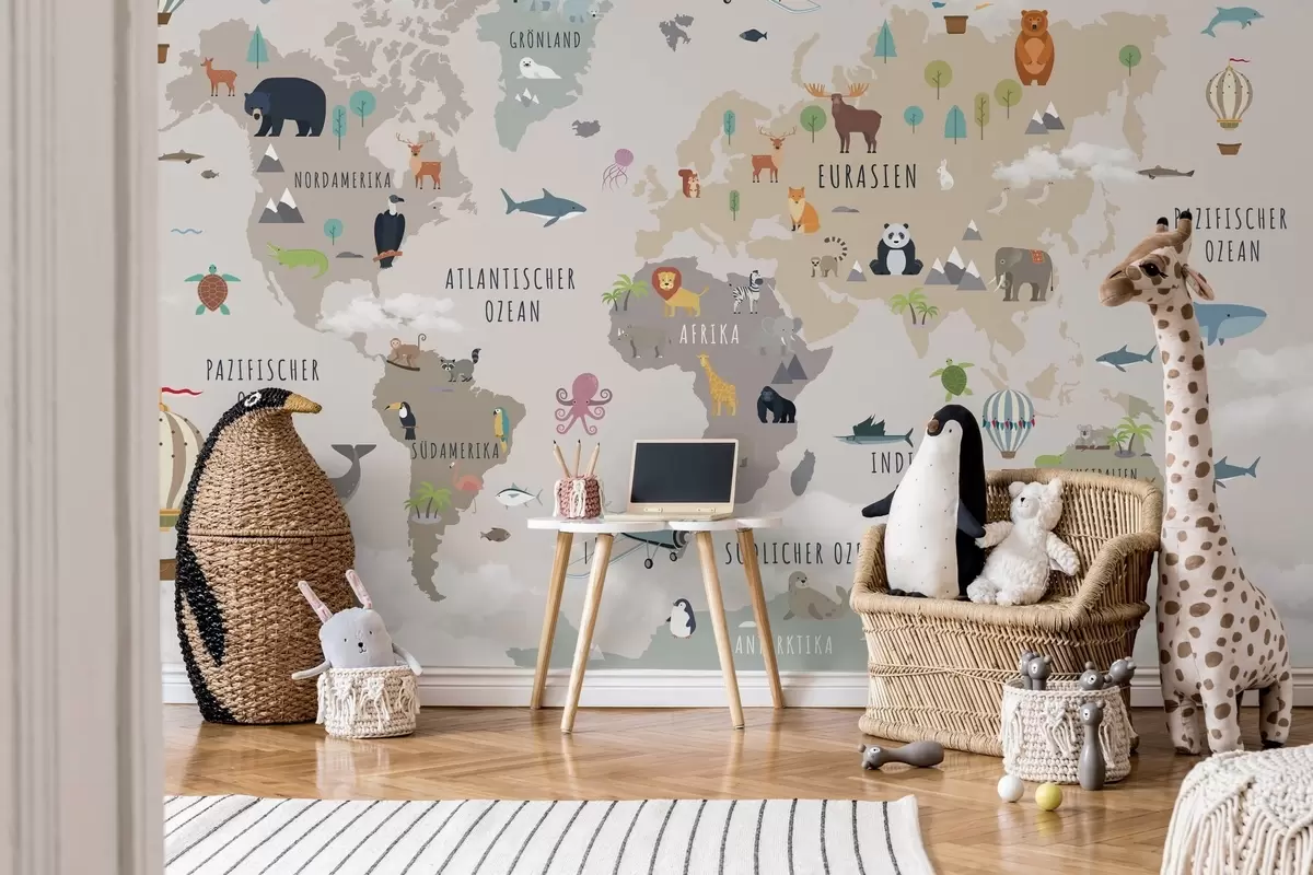 Fototapety Dětská mapa světa se zvířaty a horkovzdušnými balóny. Německý jazyk Č. c00002de