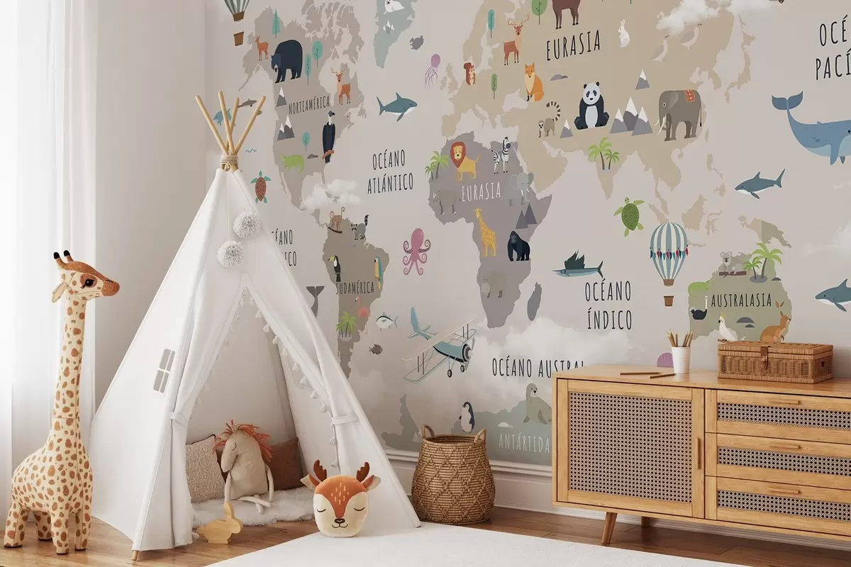 Fototapety Dětská mapa světa se zvířaty a horkovzdušnými balóny. Španělský jazyk Č. c00002es