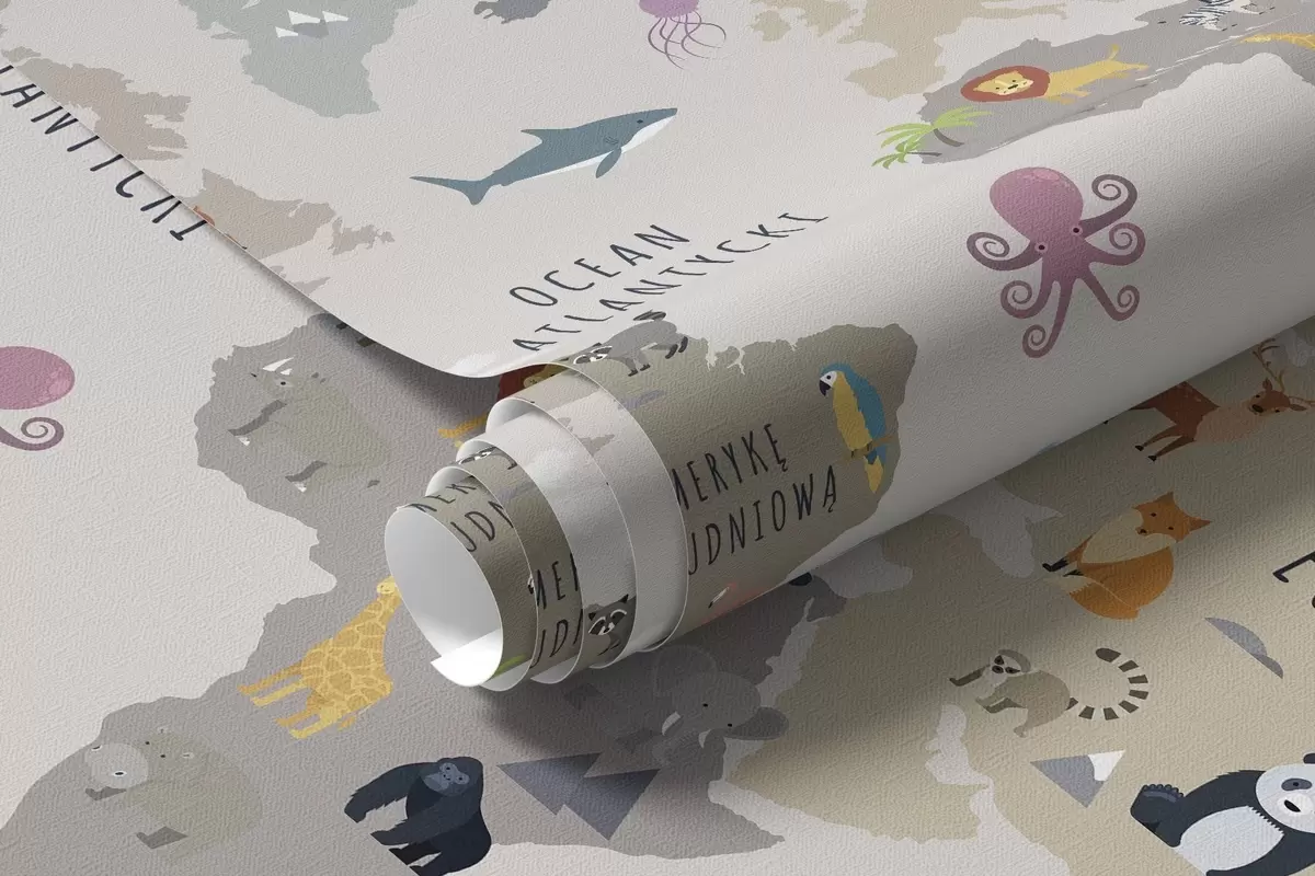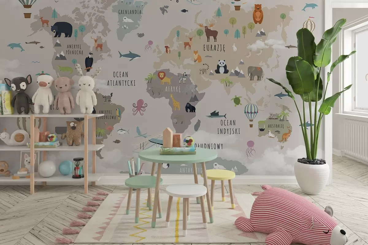 Fototapety Dětská mapa světa se zvířaty a horkovzdušnými balóny. Polský jazyk Č. c00002pl