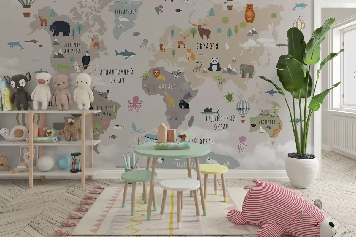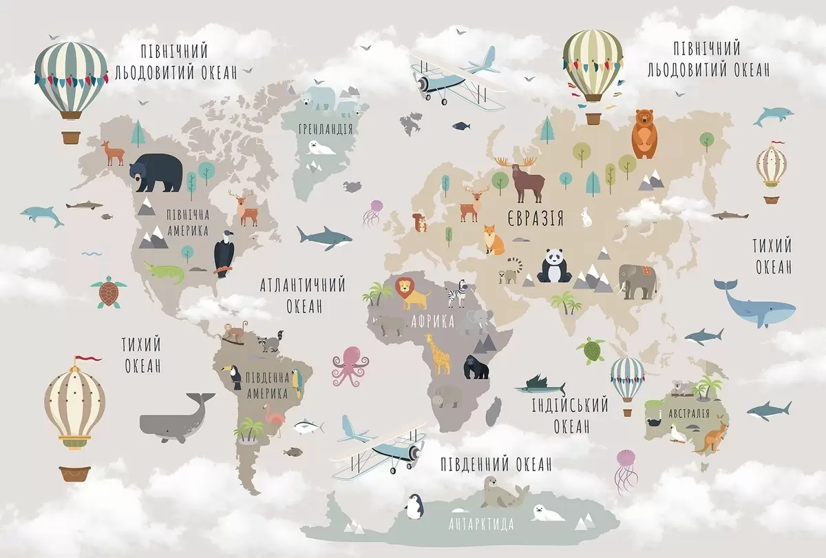 Fototapety Dětská mapa světa se zvířaty a horkovzdušnými balóny. Ukrajinský jazyk Č. c00002uk