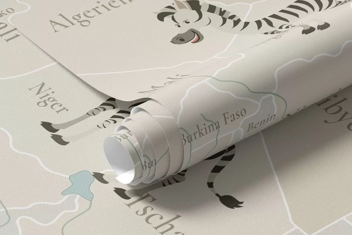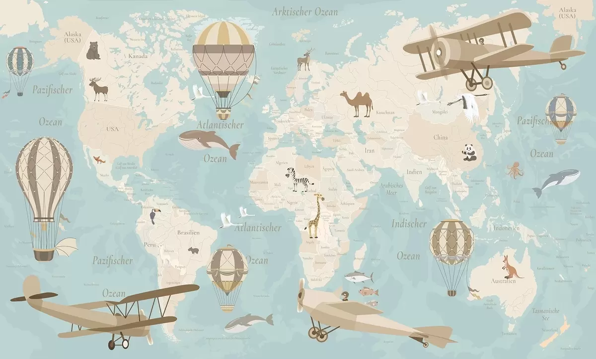 Fototapety Dětská mapa světa se zvířaty, letadly a horkovzdušnými balóny. V německém jazyce. Modrá barva. Č. c00003dev1