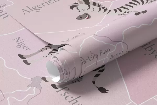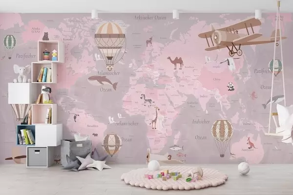 Fototapety Dětská mapa světa se zvířaty, letadly a horkovzdušnými balóny. V německém jazyce. Růžová barva. Č. c00003dev3