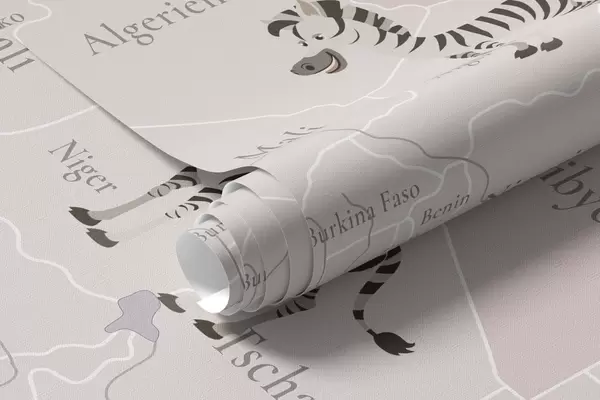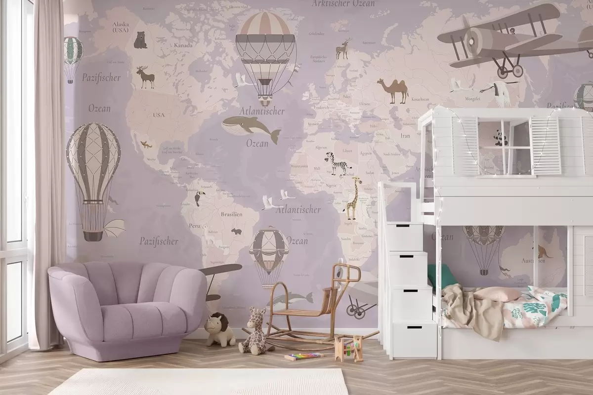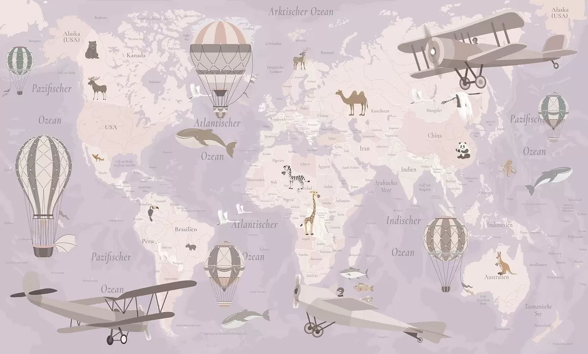 Fototapety Dětská mapa světa se zvířaty, letadly a horkovzdušnými balóny. V německém jazyce. Fialová barva. Č. c00003dev4
