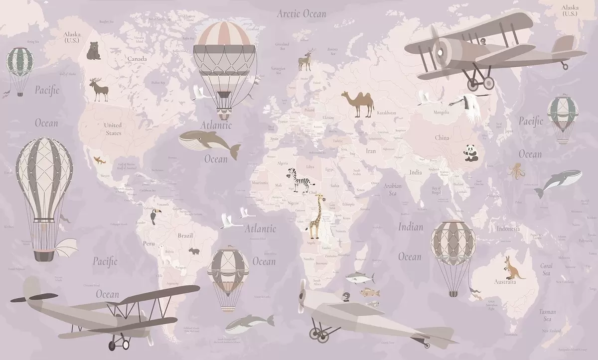 Fototapety Dětská mapa světa se zvířaty, letadly a horkovzdušnými balóny. Anglický jazyk. Fialová barva. Č. c00003env4