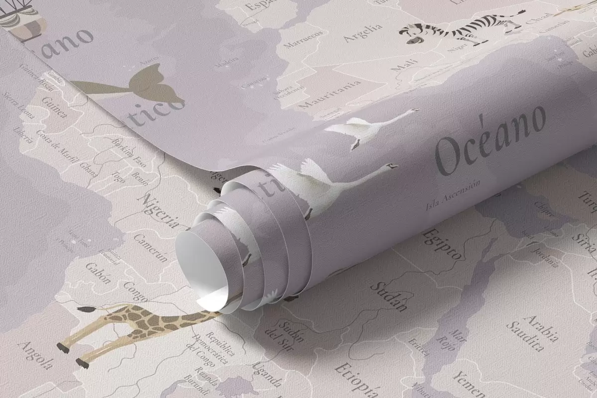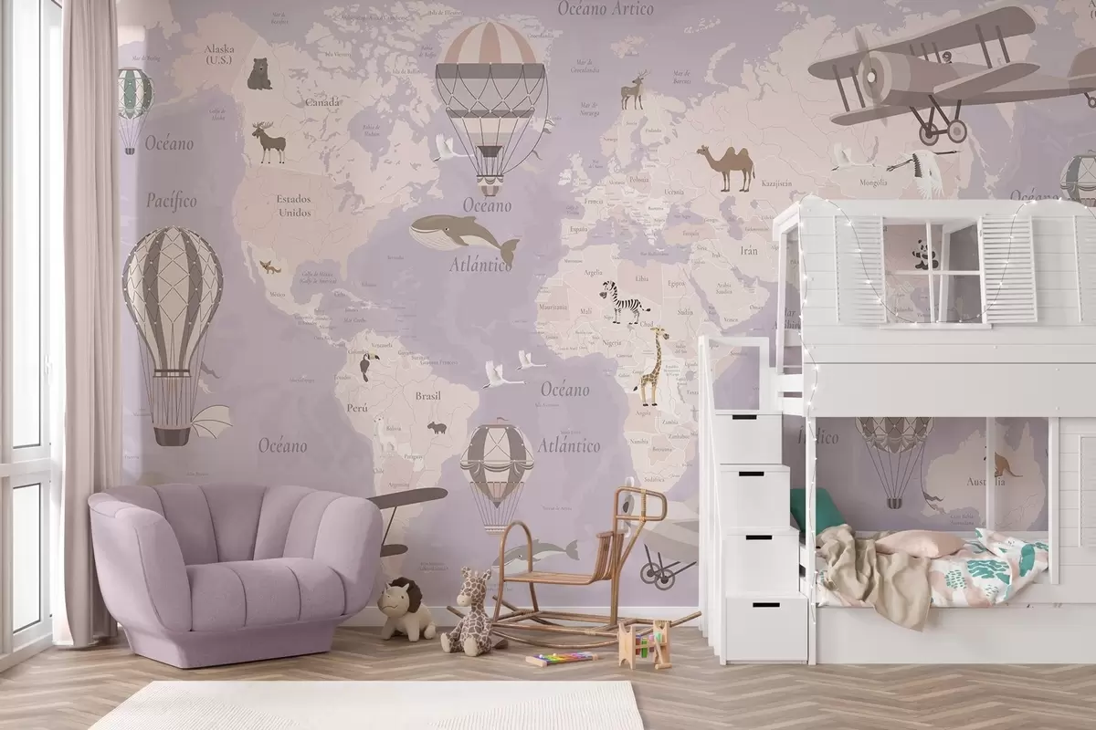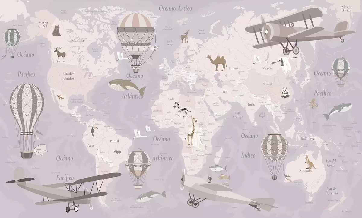 Fototapety Dětská mapa světa se zvířaty, letadly a horkovzdušnými balóny. Španělský jazyk. Fialová barva. Č. c00003esv4