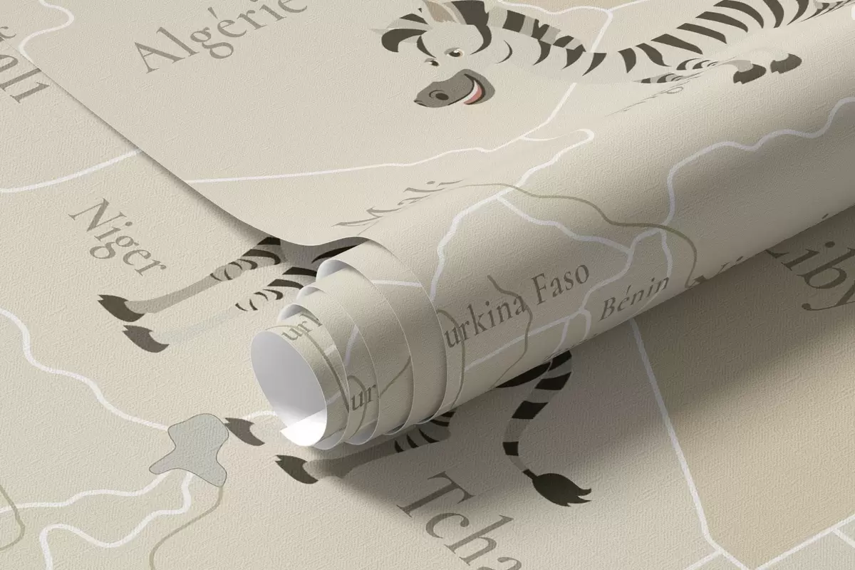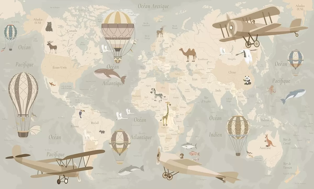 Fototapety Dětská mapa světa se zvířaty, letadly a horkovzdušnými balóny. Francouzský jazyk. Béžová barva. Č. c00003fr