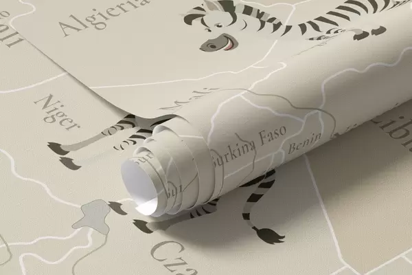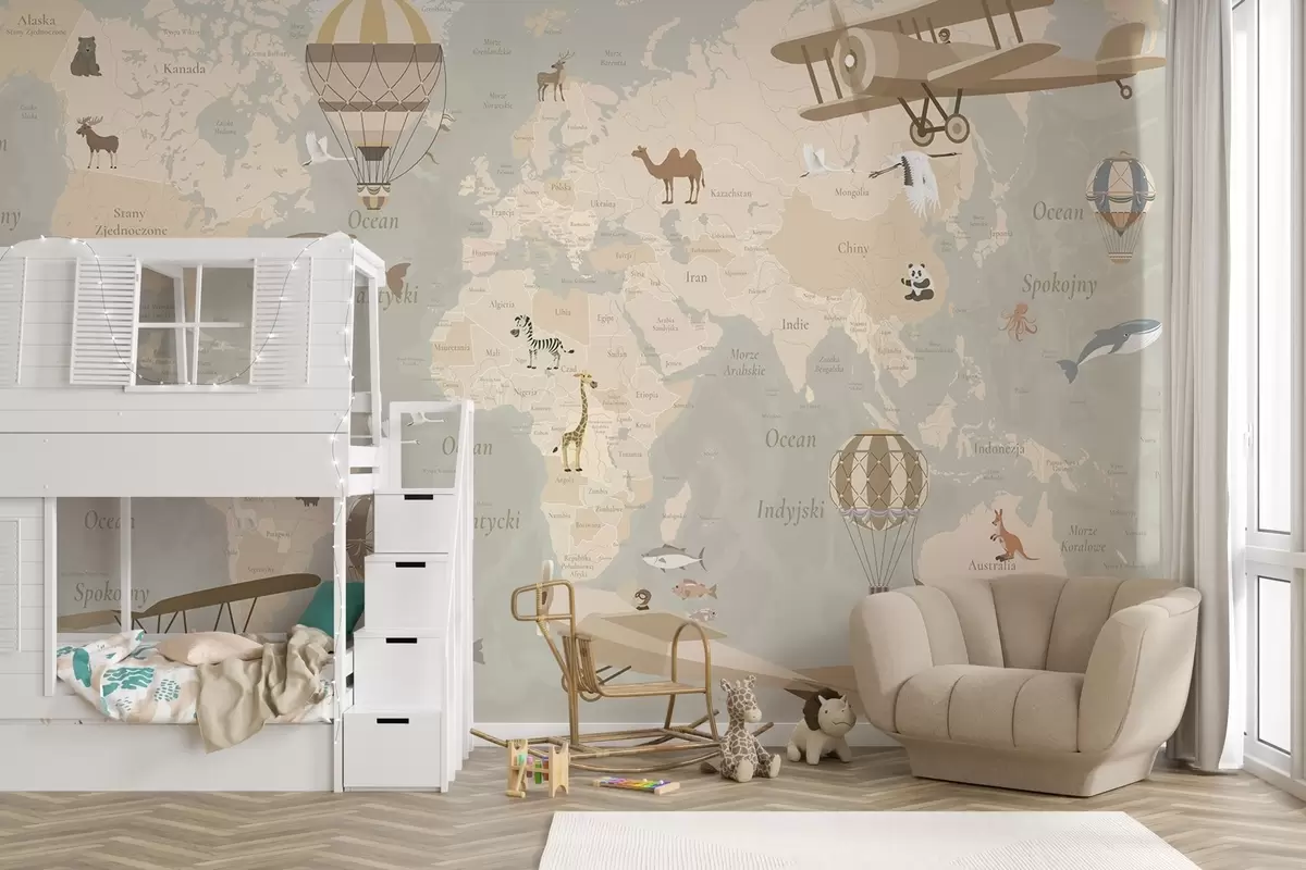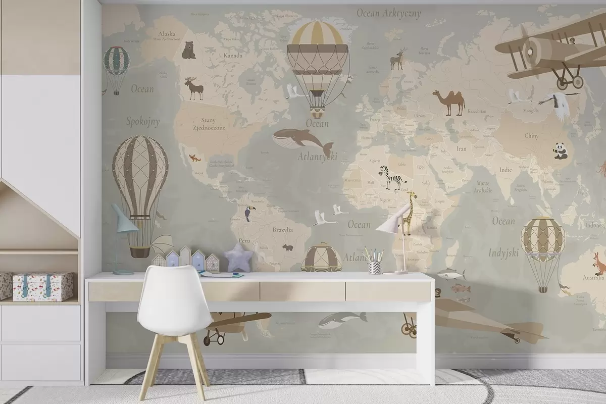 Fototapety Dětská mapa světa se zvířaty, letadly a horkovzdušnými balóny. Polský jazyk. Béžová barva. Č. c00003pl