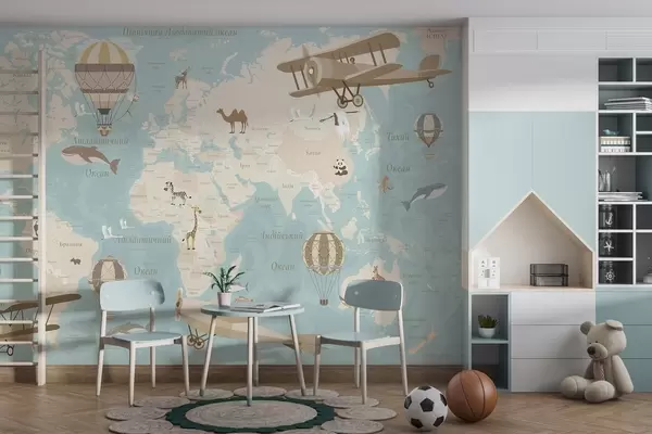 Fototapety Dětská mapa světa se zvířaty, letadly a horkovzdušnými balóny. Ukrajinský jazyk. Modrá barva. Č. c00003ukv1