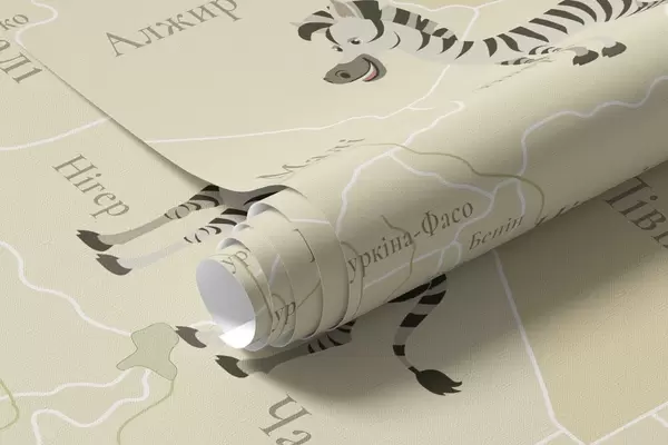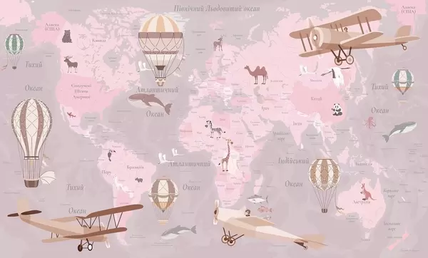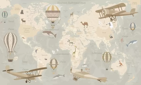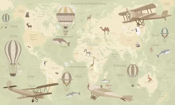 Fototapety Dětská mapa světa se zvířaty, letadly a horkovzdušnými balóny. Ukrajinský jazyk. Zelená barva. Č. c00003ukv2