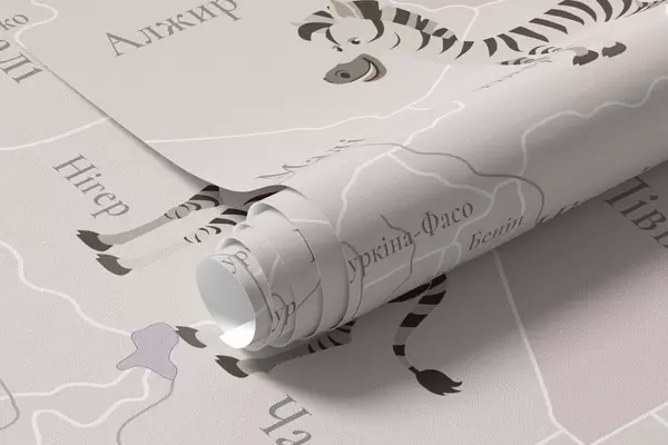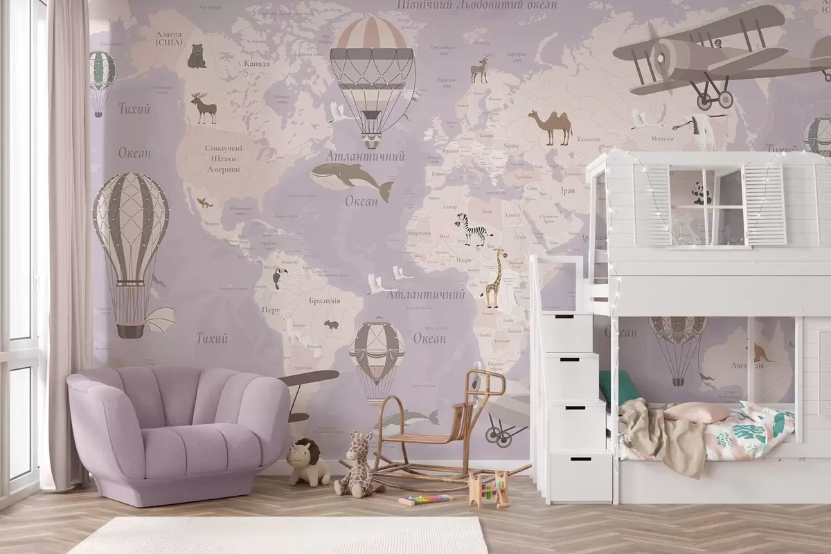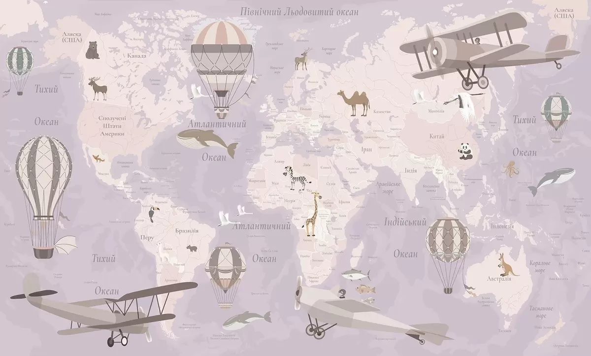 Fototapety Dětská mapa světa se zvířaty, letadly a horkovzdušnými balóny. Ukrajinský jazyk. Fialová barva. Č. c00003ukv4