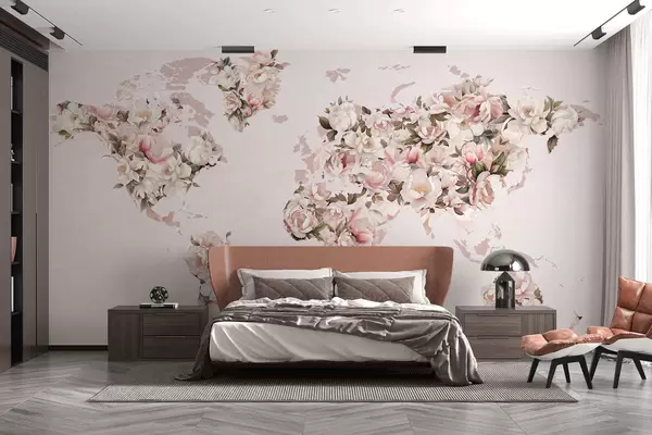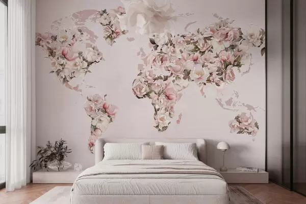 Fototapety Růžová mapa světa vytvořená z velkých bílých a růžových pivoněk Č. c00005