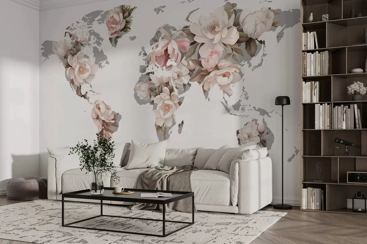 Fototapety Jemná, krémová mapa světa vytvořená z květin Č. c00008