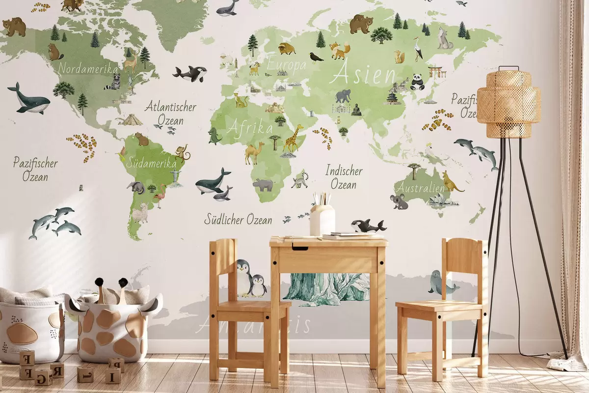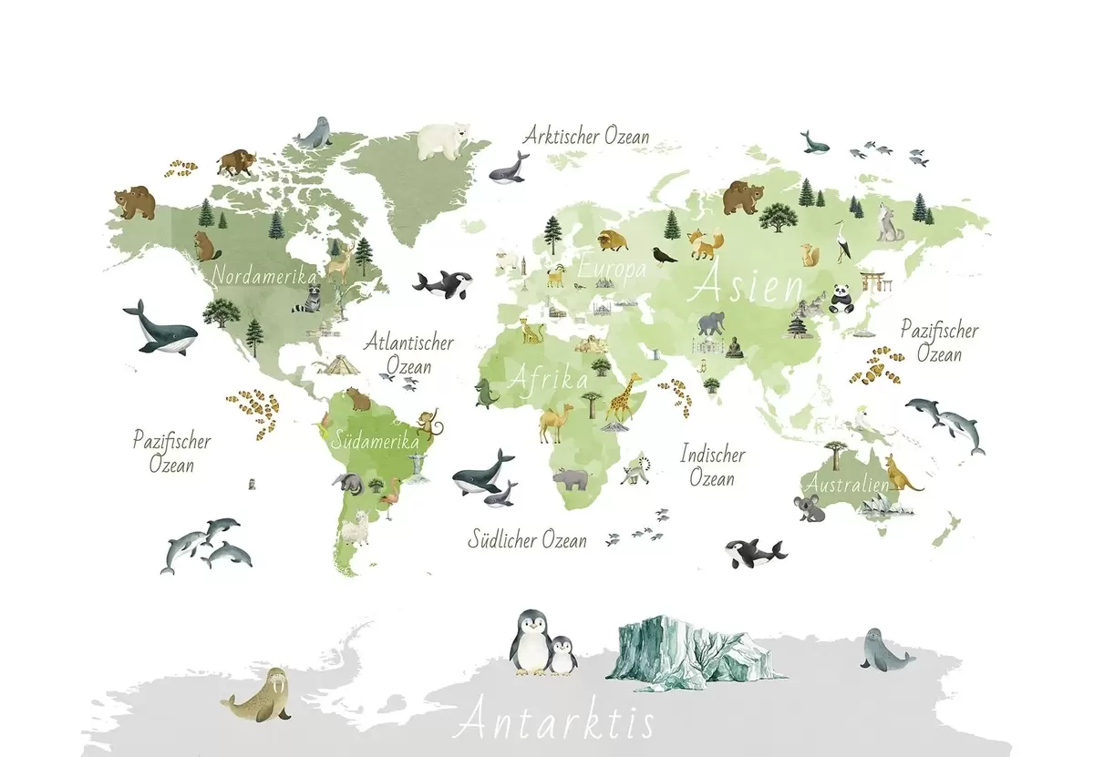 Fototapety Zelená mapa ve stylu akvarelu s motivy zvířat, rostlin a architektury. Popisky v němčině Č. c00009dev2