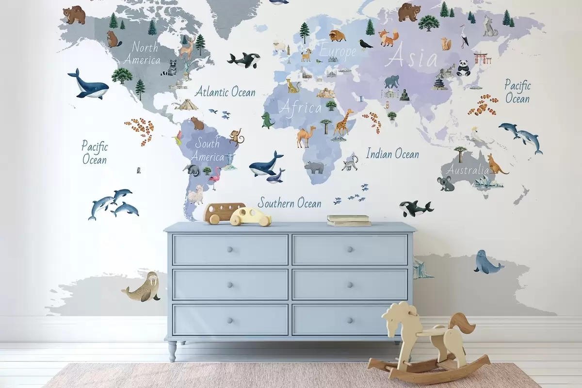 Fototapety Modrá mapa ve stylu akvarelu s motivy zvířat, rostlin a architektury. Popisky v angličtině Č. c00009env1