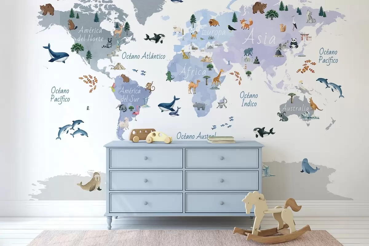 Fototapety Modrá mapa ve stylu akvarelu s motivy zvířat, rostlin a architektury. Popisky ve španělštině Č. c00009esv1