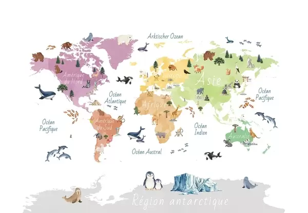 Fototapety Barevná mapa ve stylu akvarelu s motivy zvířat, rostlin a architektury. Popisky ve francouzštině Č. c00009fr