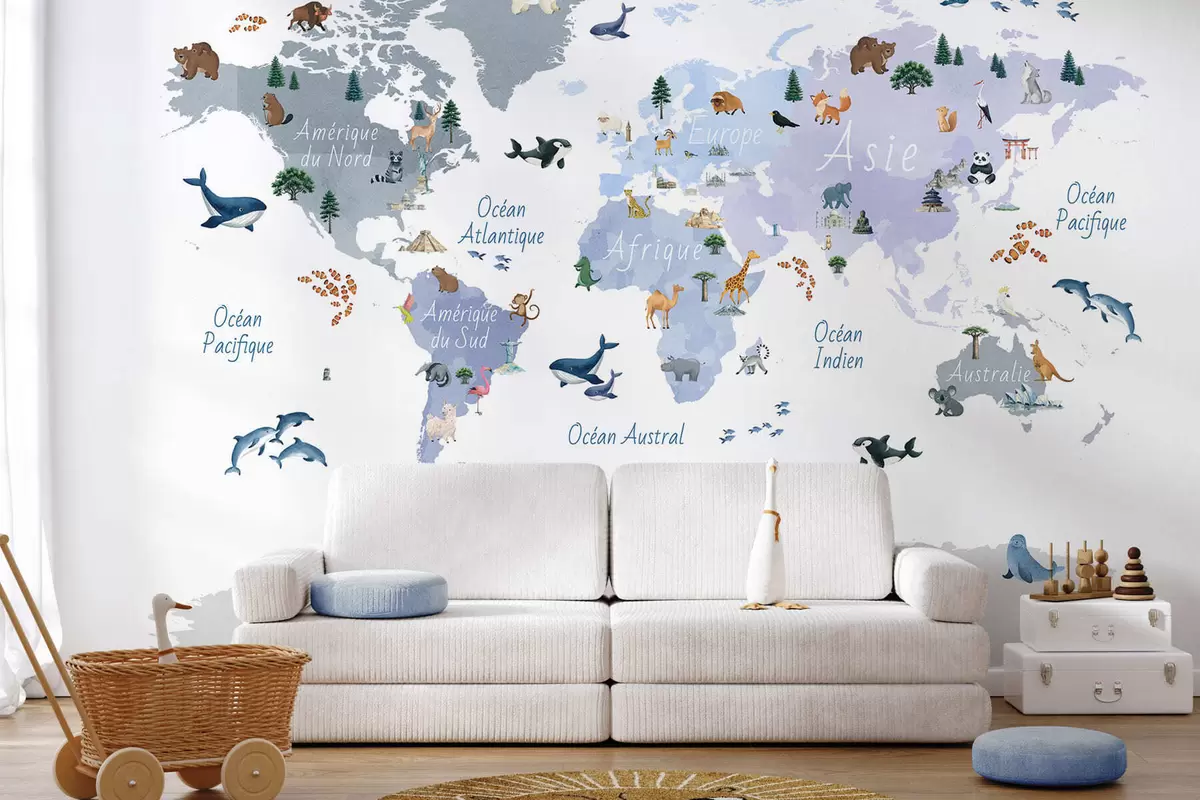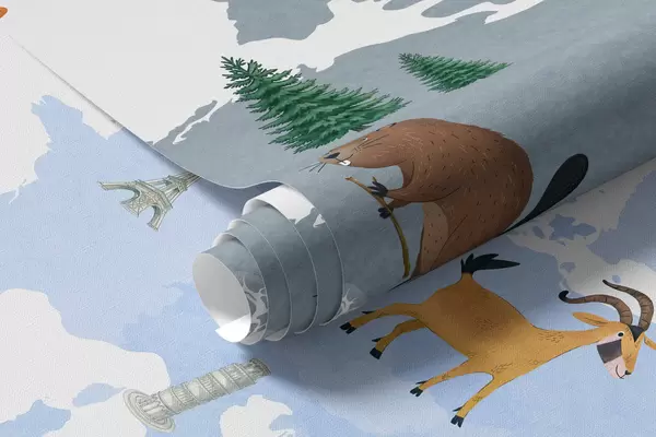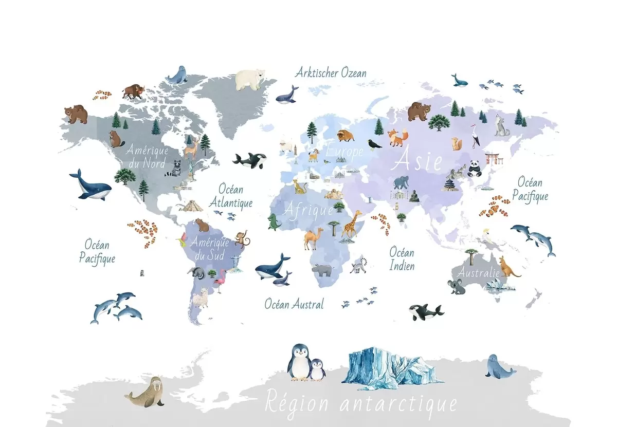 Fototapety Modrá mapa ve stylu akvarelu s motivy zvířat, rostlin a architektury. Popisky ve francouzštině Č. c00009frv1