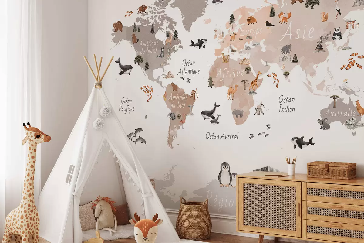 Fototapety Béžová mapa ve stylu akvarelu s motivy zvířat, rostlin a architektury. Popisky ve francouzštině Č. c00009frv3