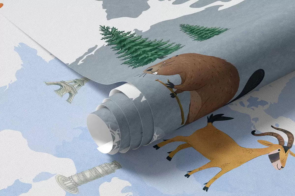 Fototapety Modrá mapa ve stylu akvarelu s motivy zvířat, rostlin a architektury. Popisky v polštině Č. c00009plv1