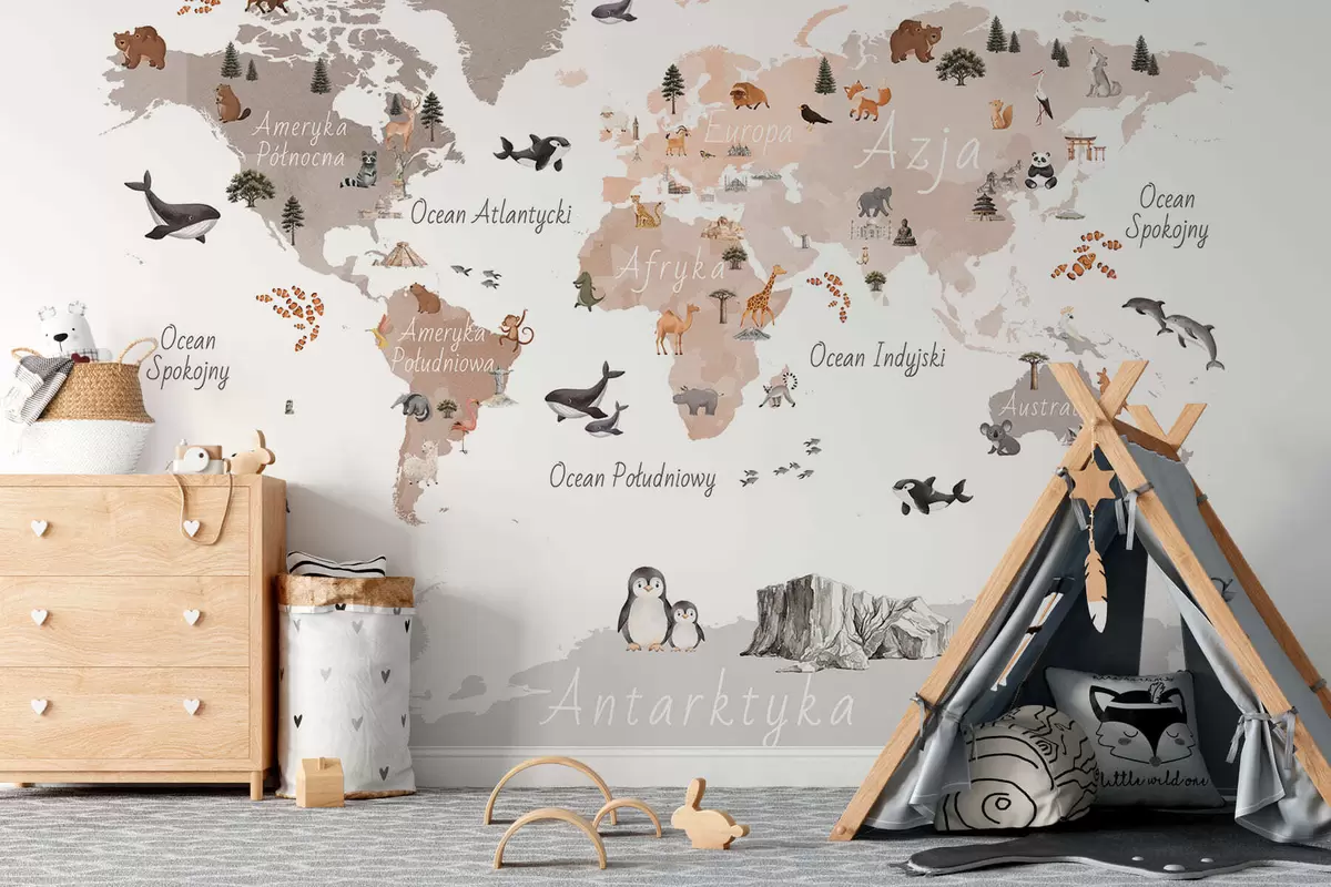 Fototapety Mapa v béžových barvách ve stylu akvarelu, na které jsou vyobrazena zvířata, rostliny a architektonické prvky. Popisky v polštině Č. c00009plv3