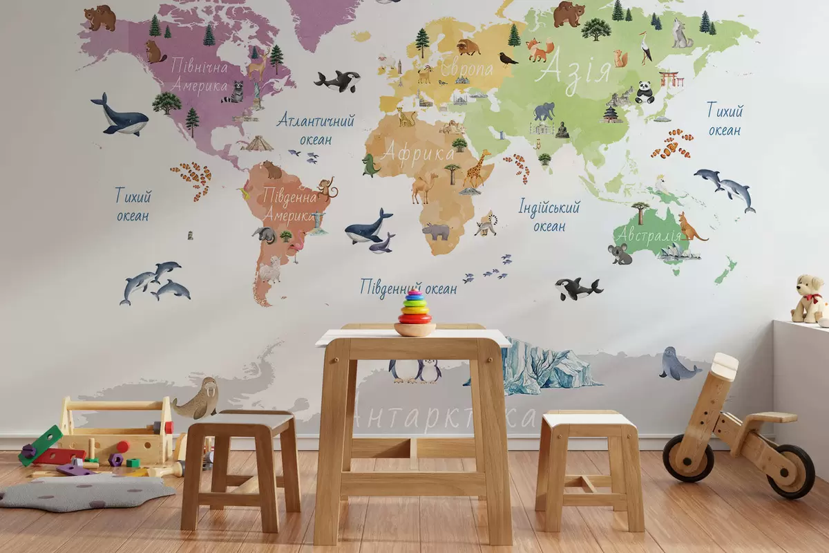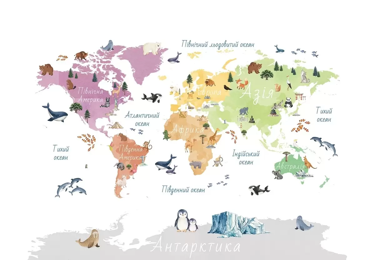Fototapety Barevná mapa ve stylu akvarelu s vyobrazením zvířat, rostlin a architektury. Popisky v ukrajinštině Č. c00009uk