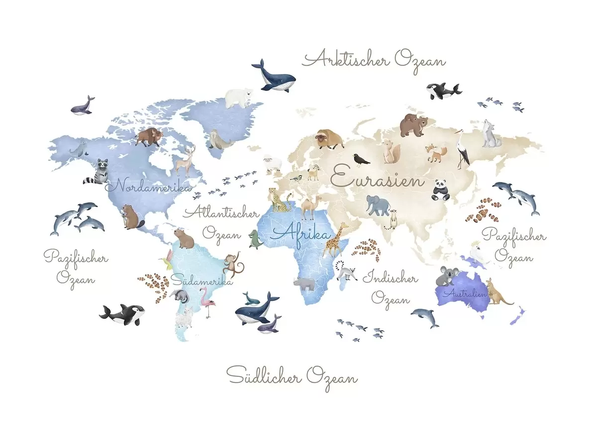 Fototapety Modrá mapa ve stylu akvarelu s motivy zvířat. Popisky v němčině Č. c00012dev1