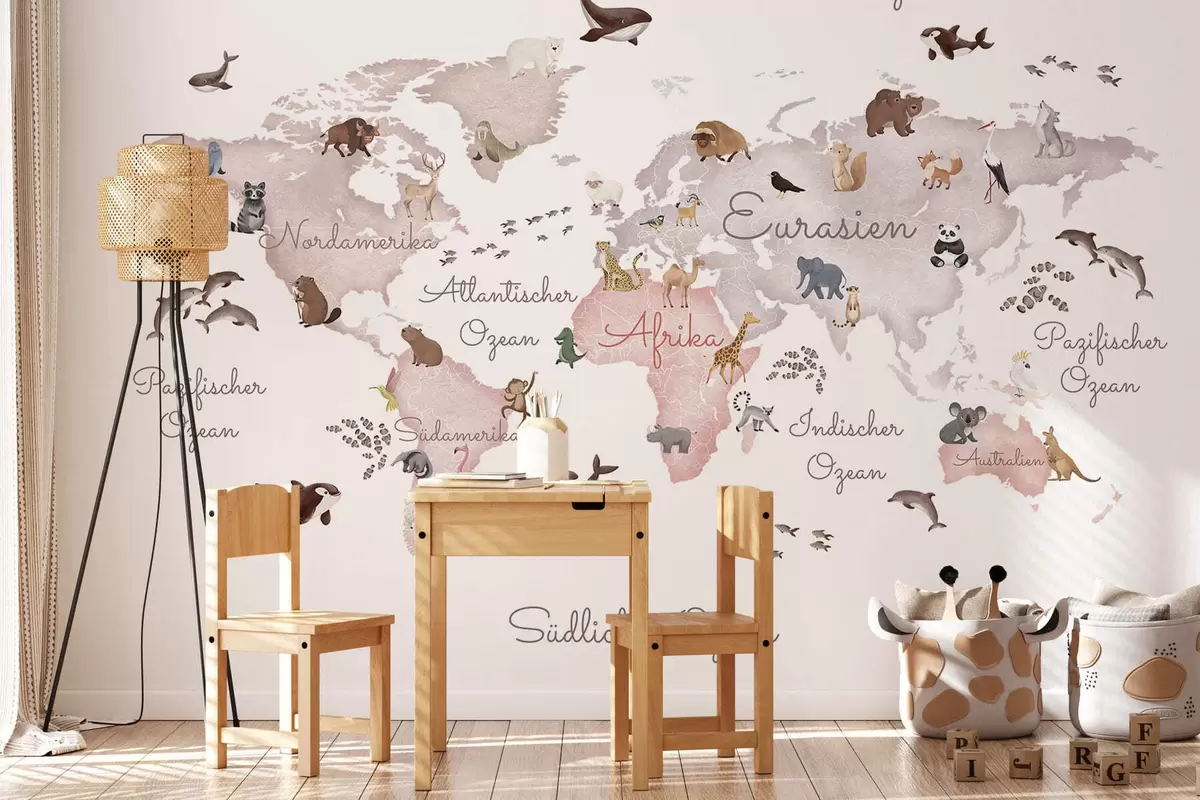 Fototapety Béžová mapa ve stylu akvarelu s motivy zvířat. Popisky v němčině Č. c00012dev3