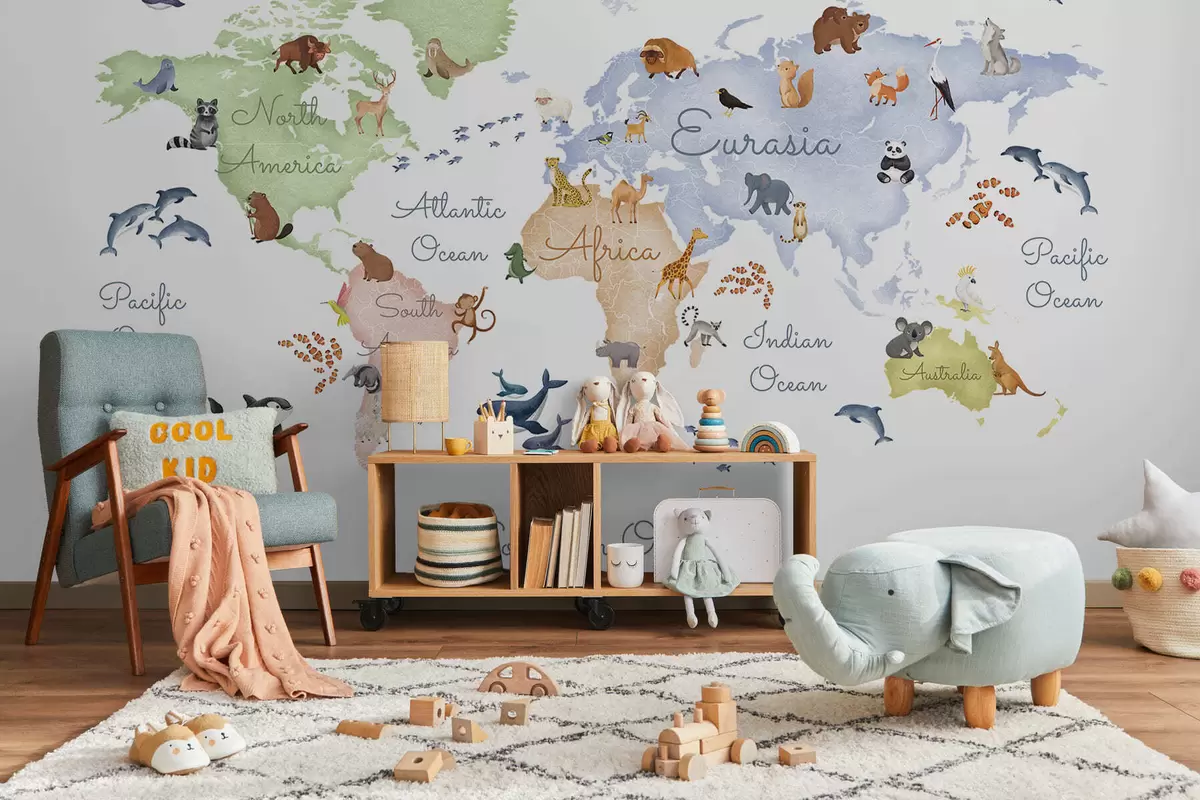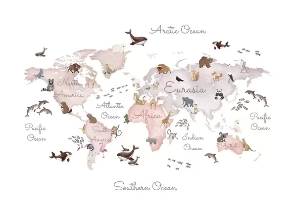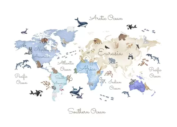 Fototapety Barevná mapa ve stylu akvarelu s vyobrazením zvířat. Popisky v angličtině Č. c00012en