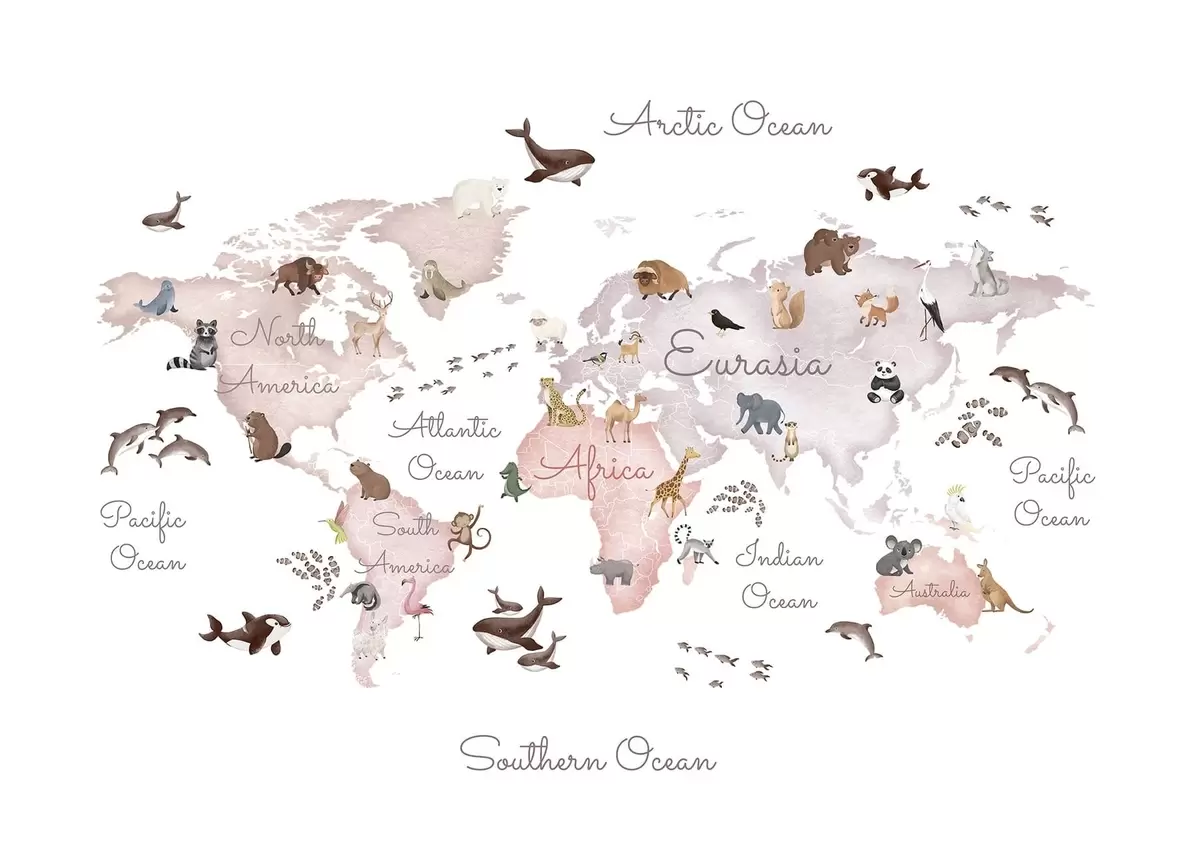 Fototapety Béžová mapa ve stylu akvarelu s motivy zvířat. Popisky v angličtině Č. c00012env3