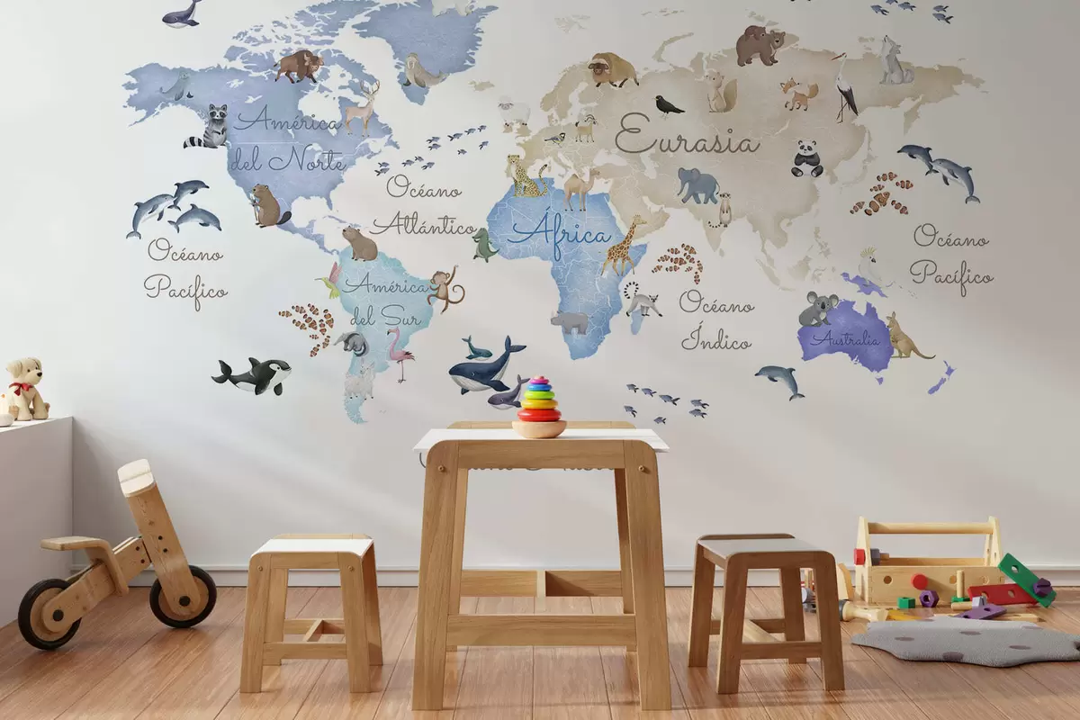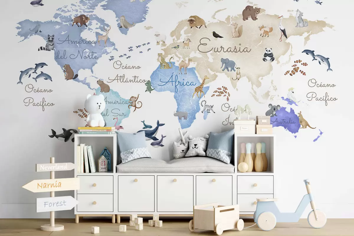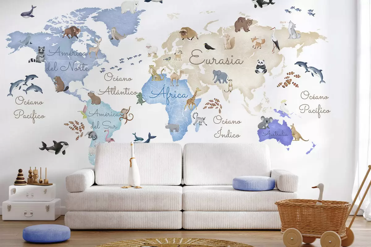 Fototapety Modrá mapa ve stylu akvarelu s motivy zvířat. Popisky ve španělštině Č. c00012esv1
