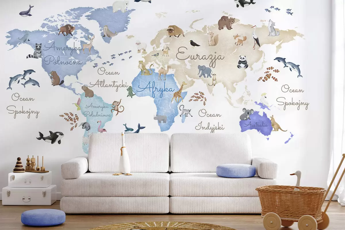 Fototapety Modrá mapa ve stylu akvarelu s motivy zvířat. Popisky v polštině Č. c00012plv1