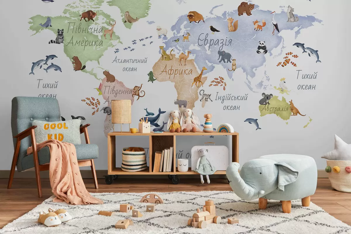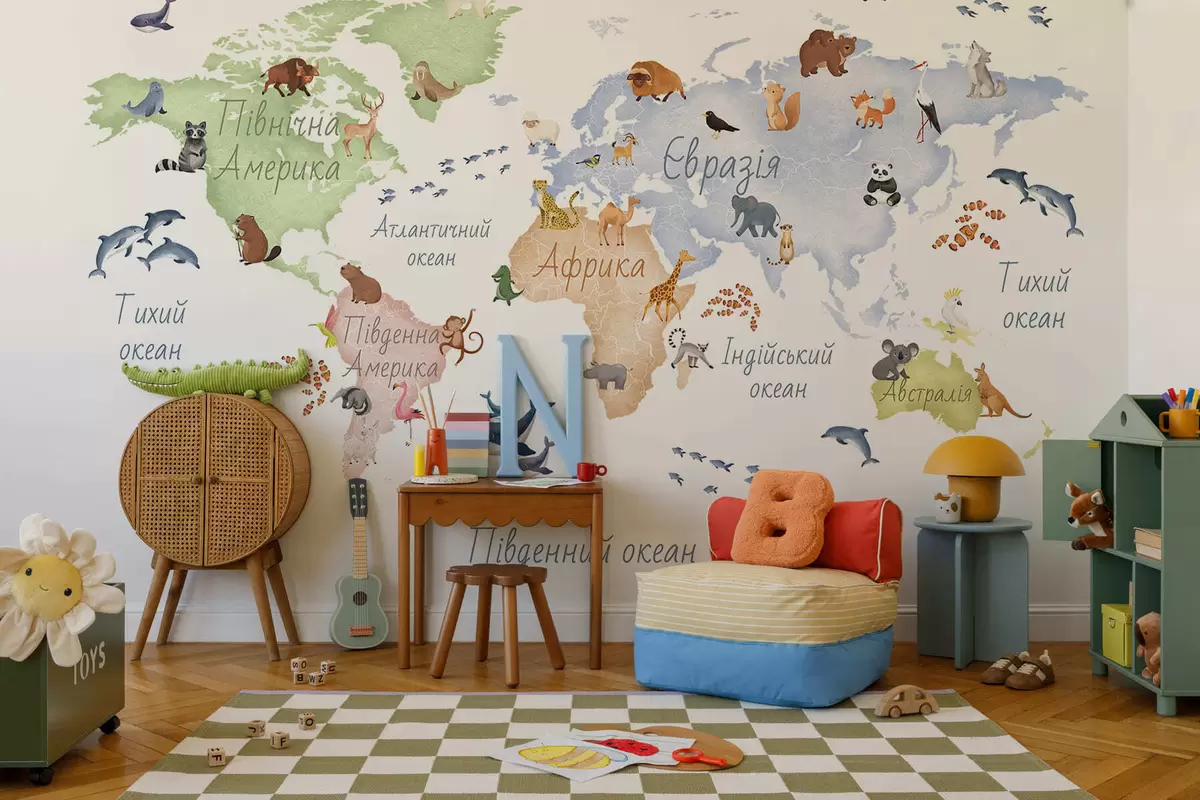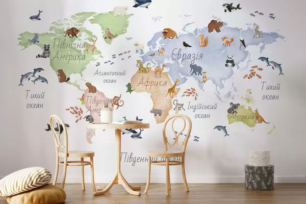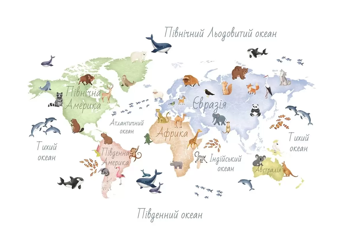 Fototapety Barevná mapa ve stylu akvarelu s vyobrazením zvířat. Popisky v ukrajinštině Č. c00012uk