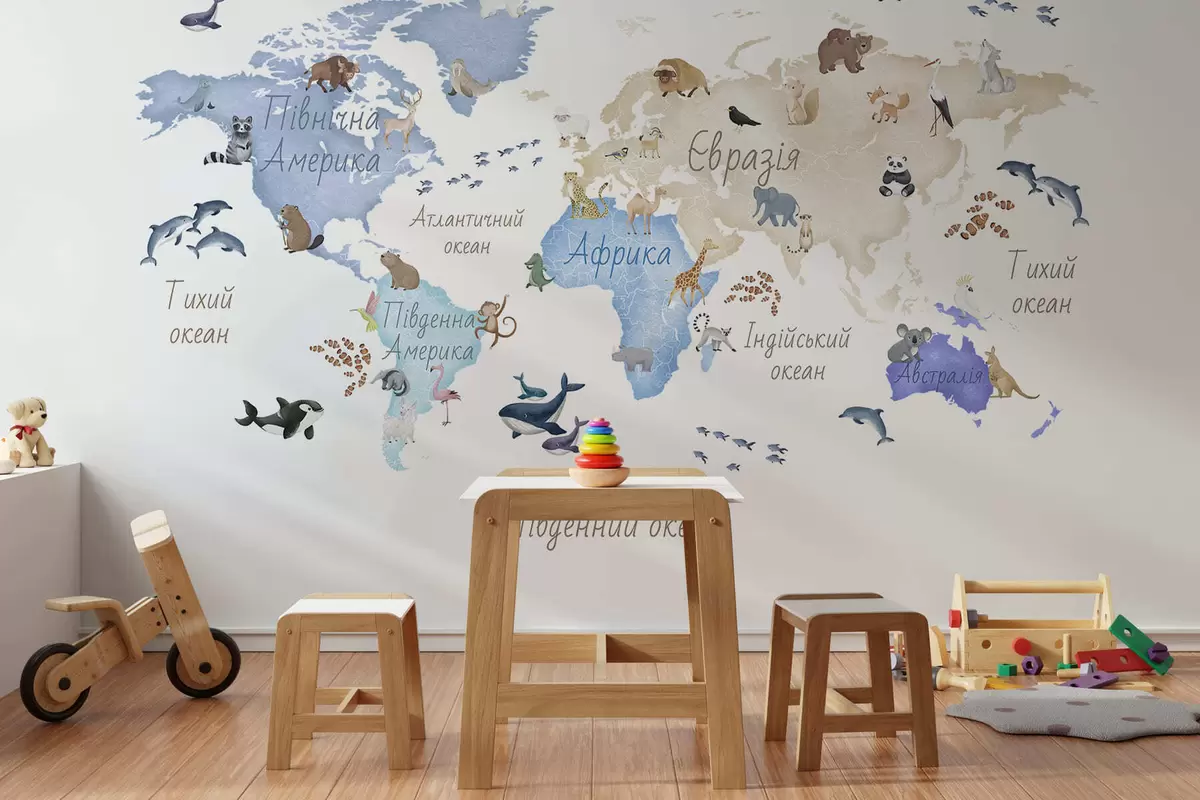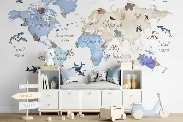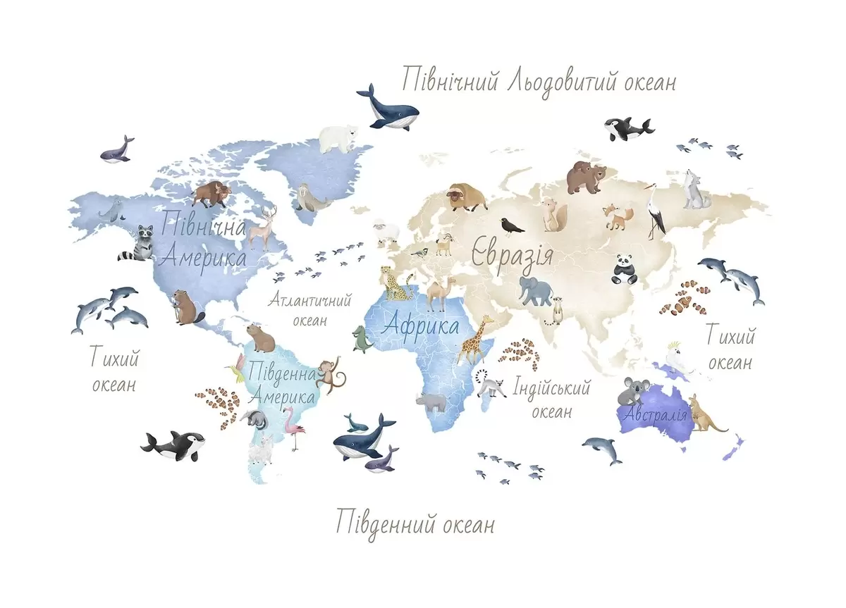 Fototapety Modrá mapa ve stylu akvarelu s motivy zvířat. Popisky v ukrajinštině Č. c00012ukv1