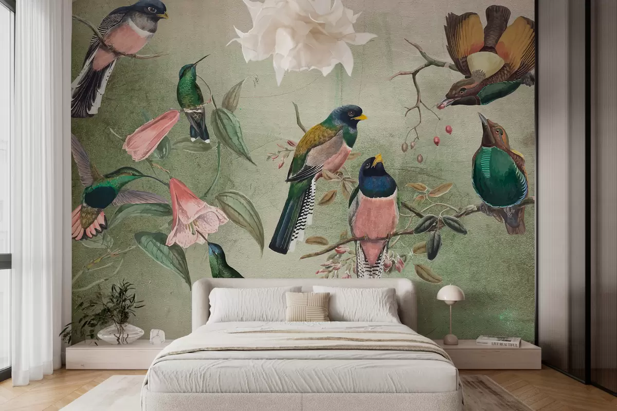 Fototapety Skupina barevných ptáků posazených na větvích v texturovaném pozadí Č. w00543