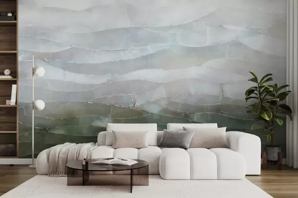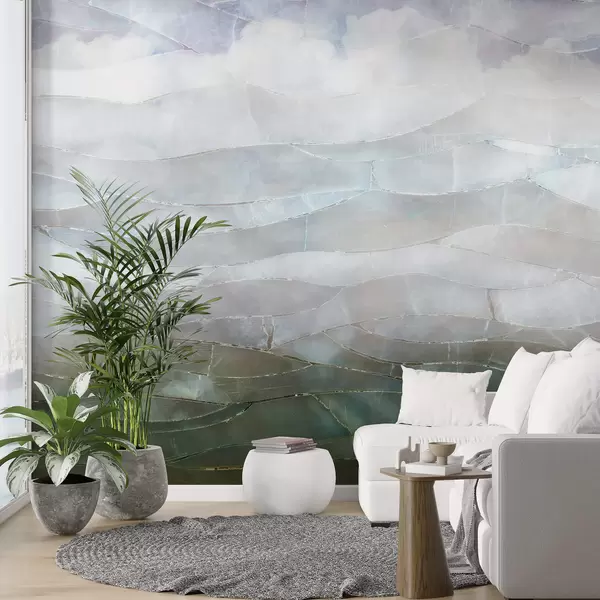 Fototapety Texturovaná mlhavá, kopcovitá abstraktní krajina s přechodem se zelenými poli v mlze Č. w00795