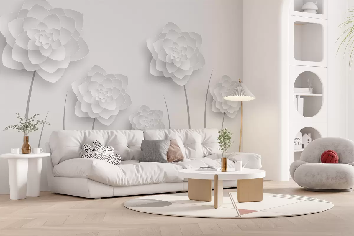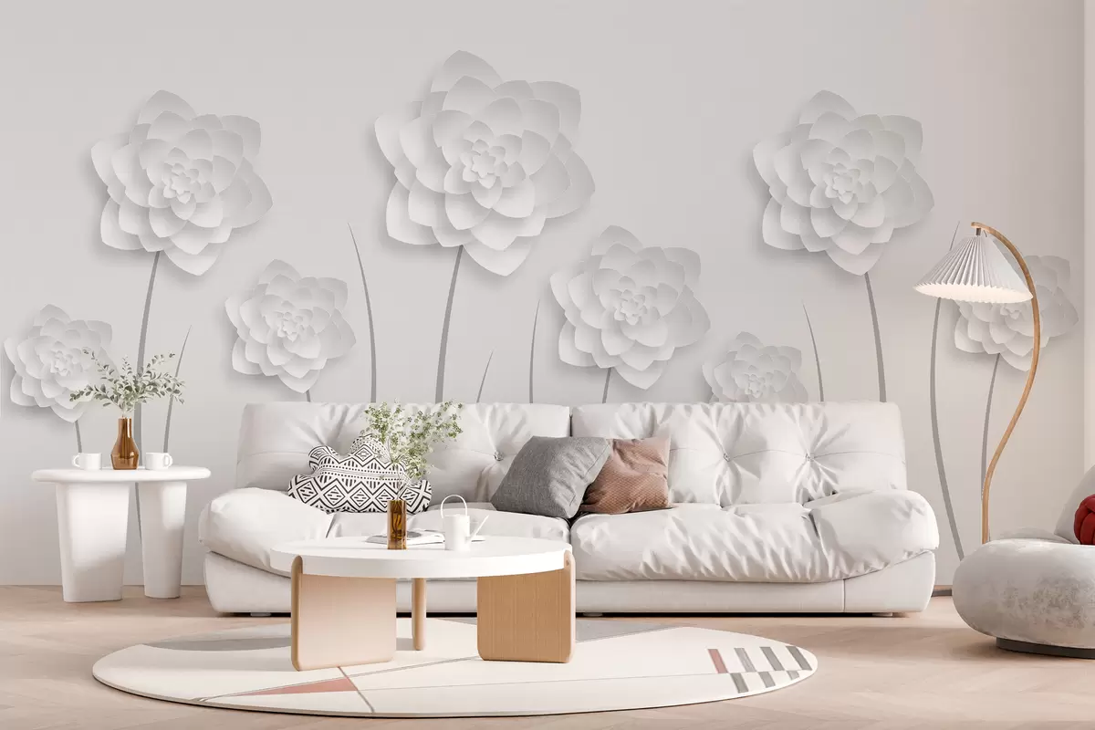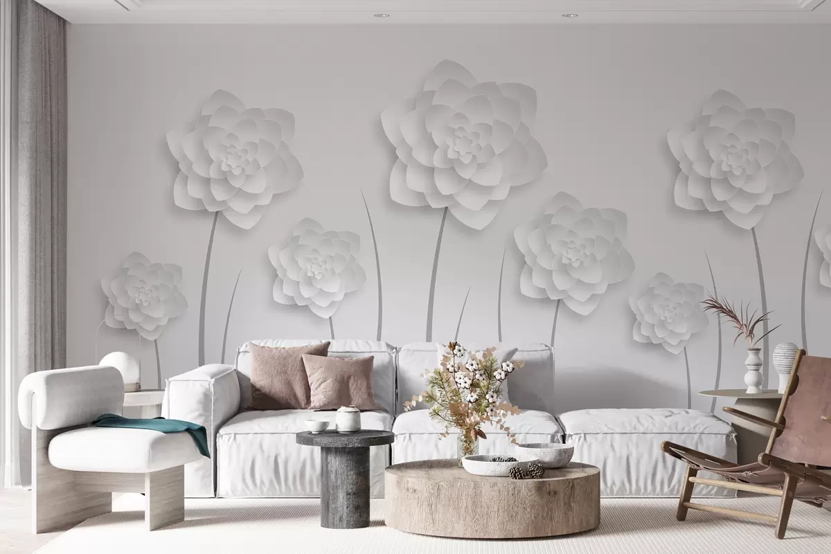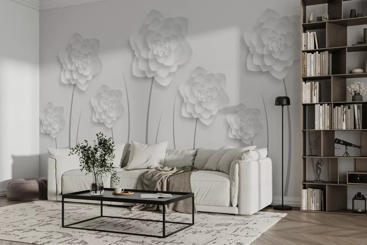 Fototapet Velké květy s imitací objemu v papírovém stylu na světle šedém podkladu s šedým stonkem w01021
