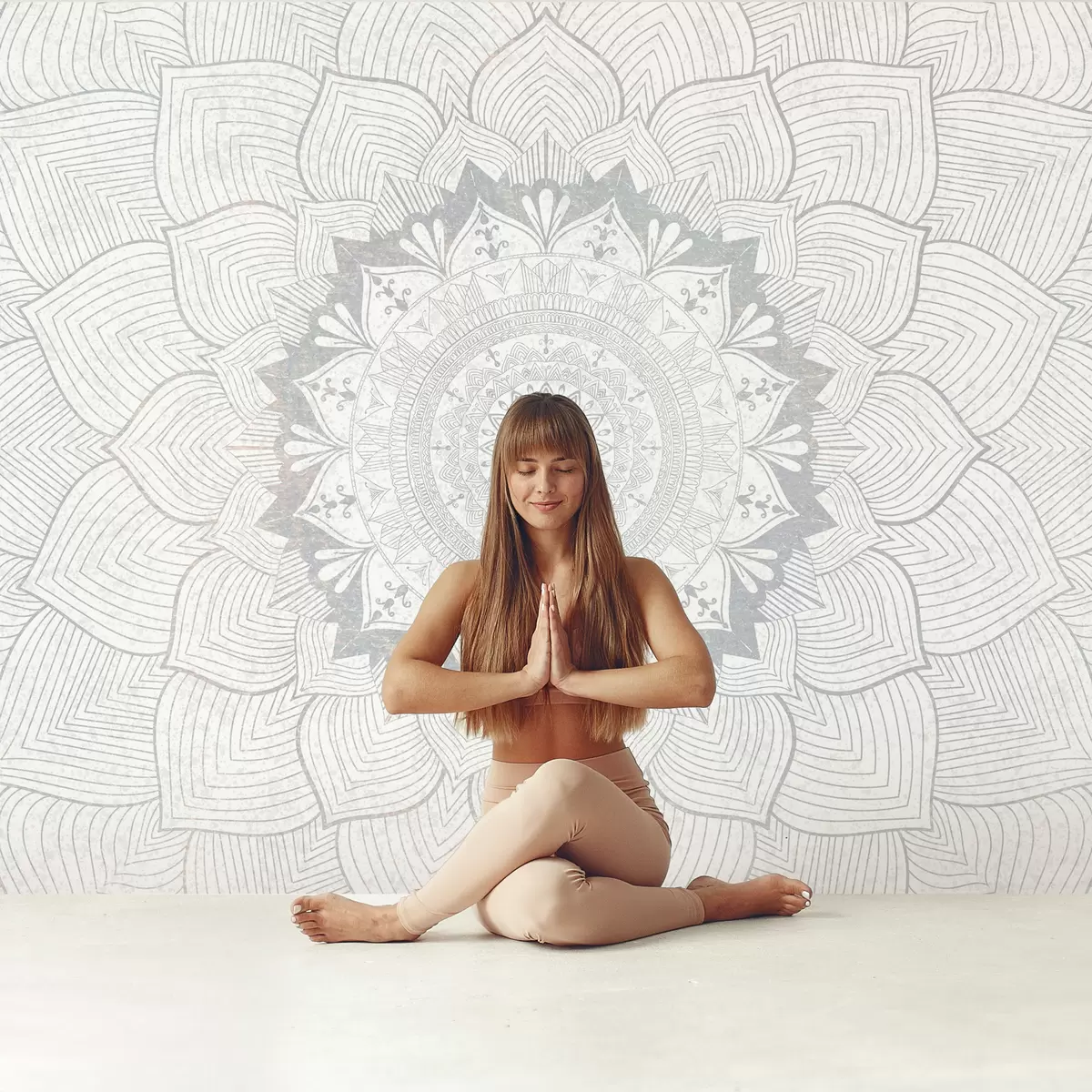 Fototapety Kulatá mandala, tapeta pro prostor na jógu nebo pro harmonizaci osobního prostoru. Nástěnná mandala v šedých odstínech na strukturovaném heterogenním pozadí Č. w01088v2