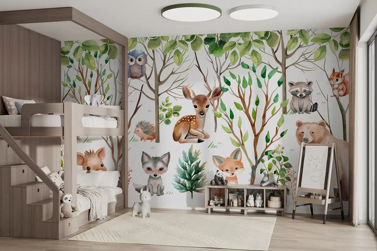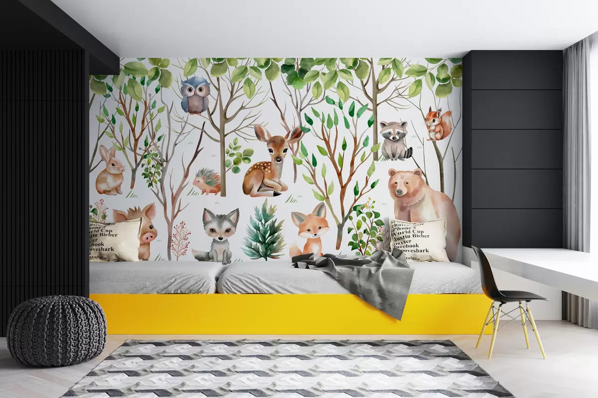 Fototapety Dětské tapety lesní zvířata. Barevná tapeta na bílém pozadí Č. w01127
