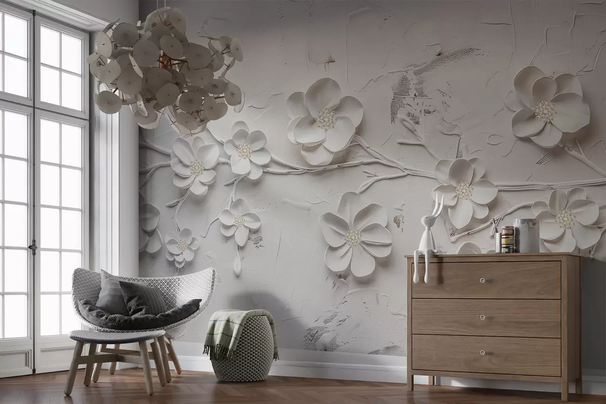 Fototapety Bílé texturované pozadí s 3D bílými květy v plném květu, propojené větvemi, minimalistické a elegantní Č. w01226