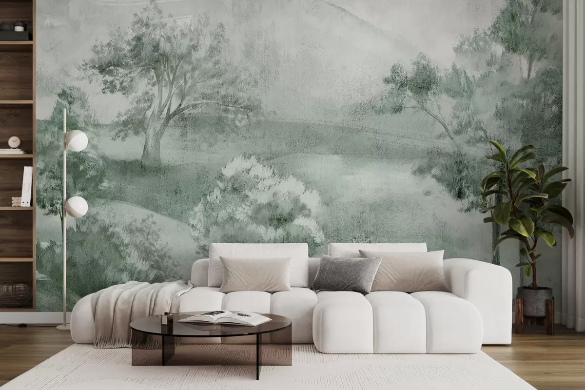 Fototapety Krajinomalba zamlžené krajiny obklopené bujnými stromy a listím v odstínech modré Č. w01247v2
