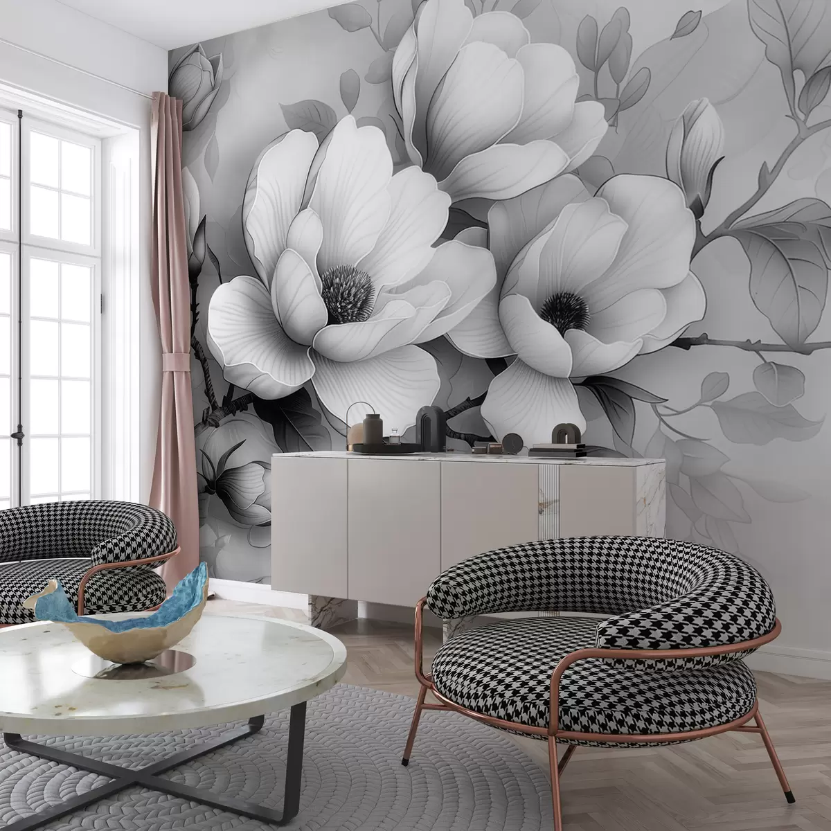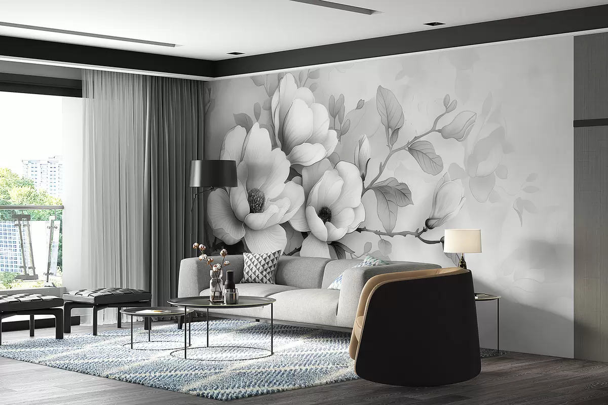 Fototapety Černobílá ilustrace magnólie na šedém pozadí Č. w01277