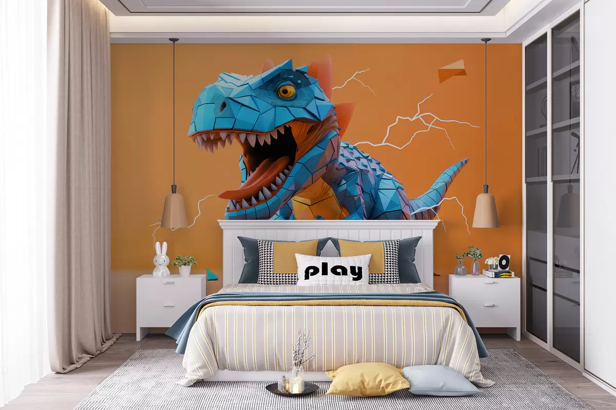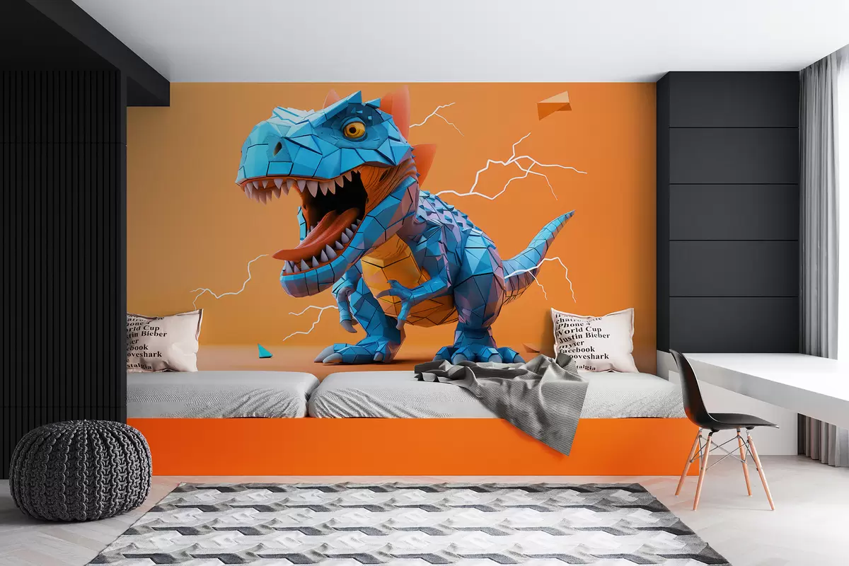 Fototapety Divoký dinosaurus s úderem blesku ve žluté a modré barvě Č. w01333v1