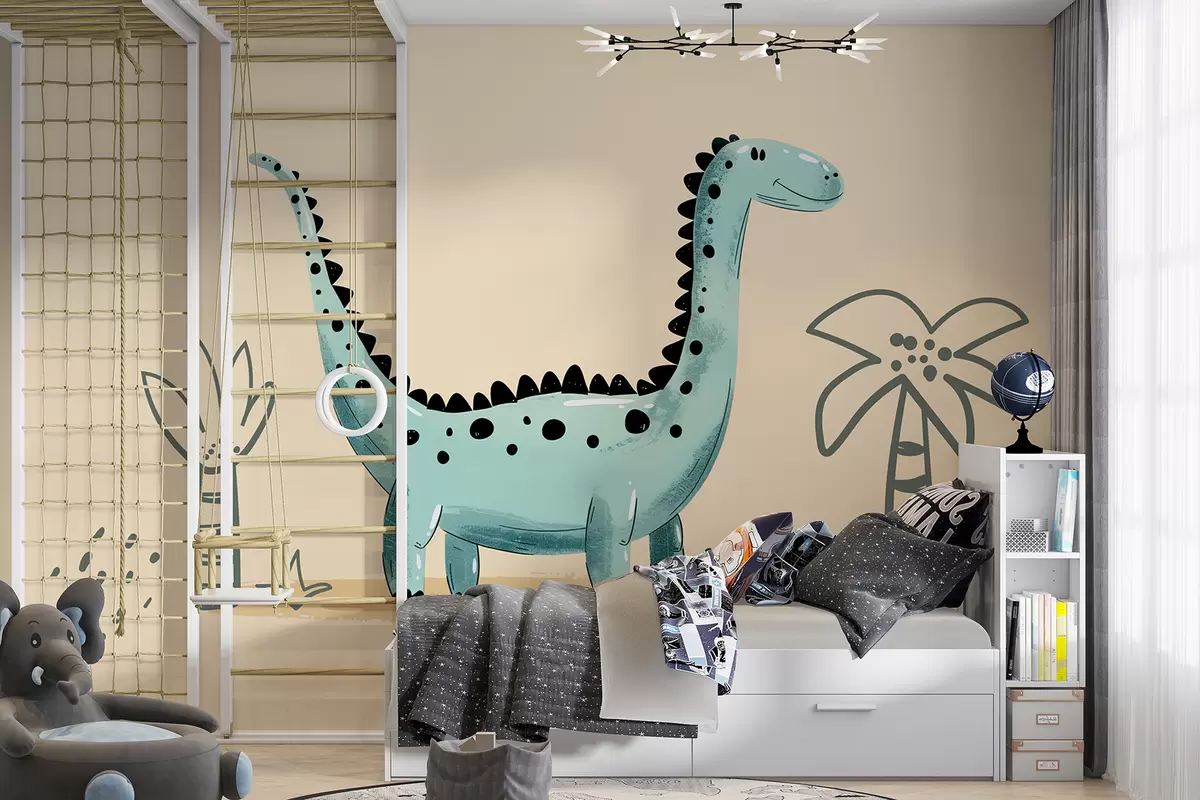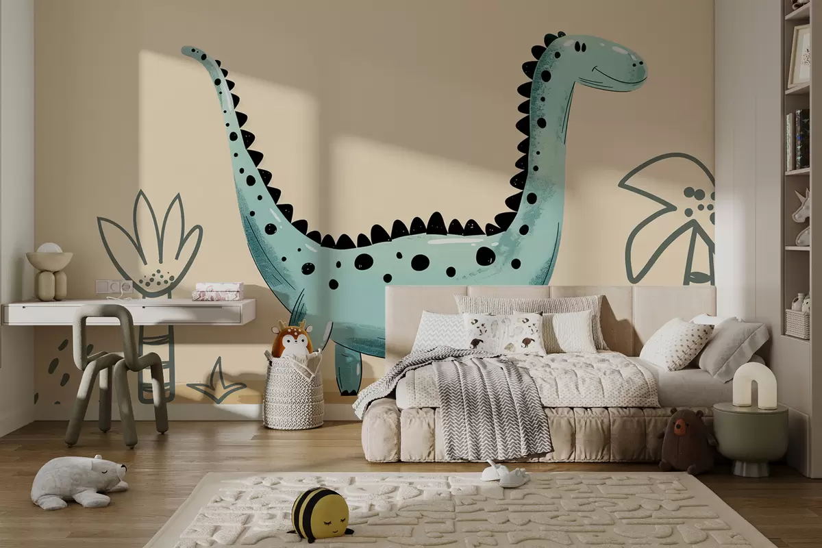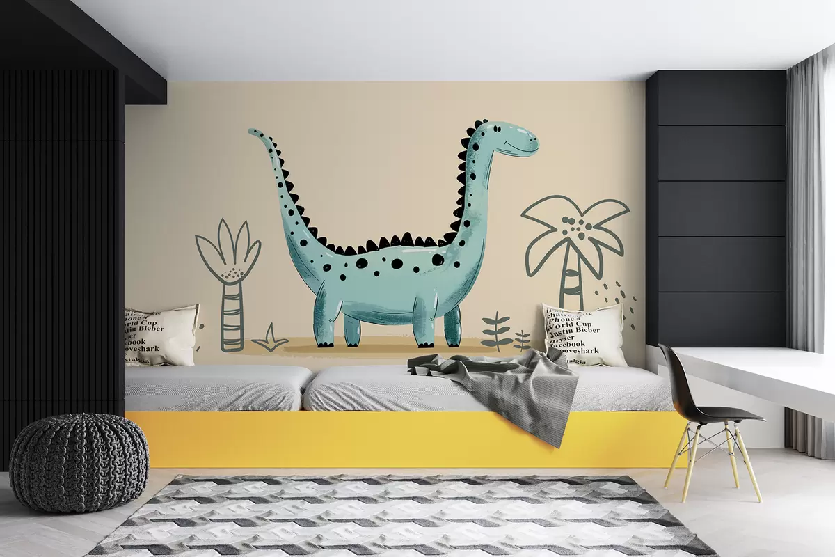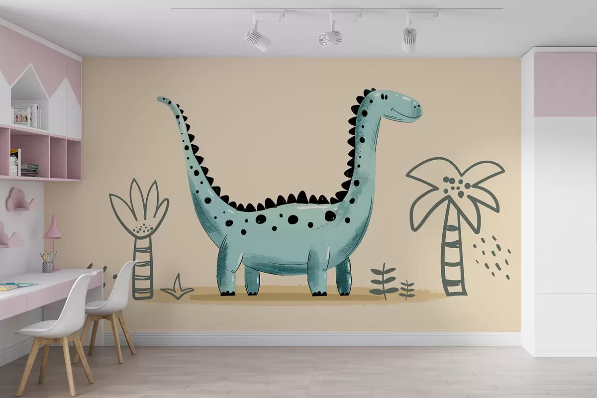 Fototapety Roztomilý dinosaurus na béžovém pozadí s palmami Č. w01357v1