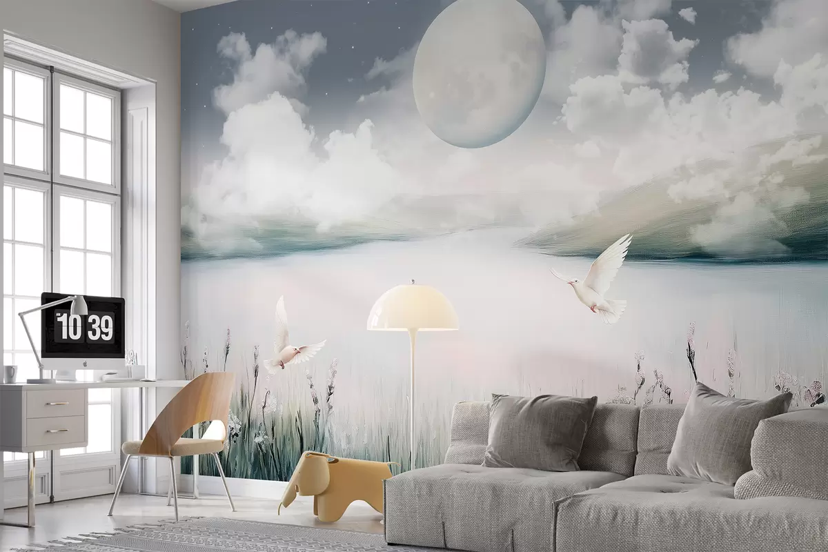 Fototapety Krásná krajina s jezerem, květinová louka, měsíc na noční hvězdné obloze, létající ptáci, mraky Č. w01389