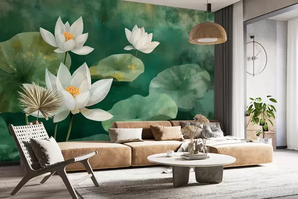 Fototapety Lotosy v jezeře, mlha, kresba akvarelem, velké listy, džungle, přírodní barevná paleta Č. w01452